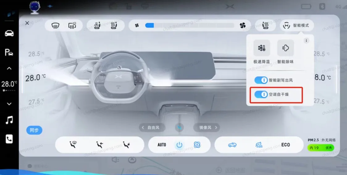 G9、P7、G6等有空调自清洁功能的车型,可以开启后将智能检测空调系统积水情况,运行自干燥功能,减少细菌滋生,降低车内产生异味的几率。