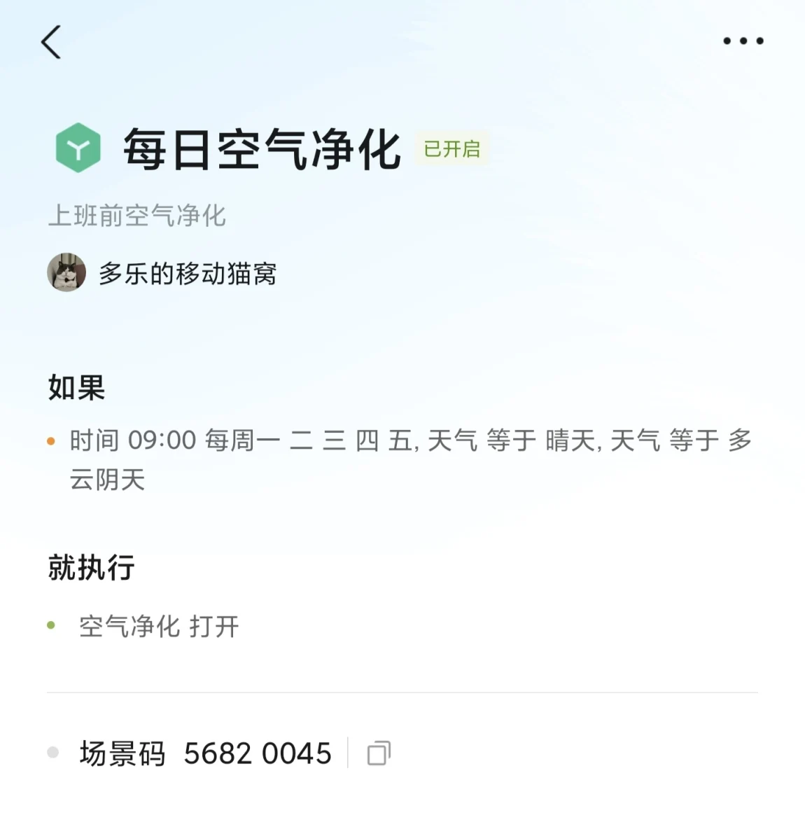 2.设置智慧场景,每日上班前自动开启空气净化。