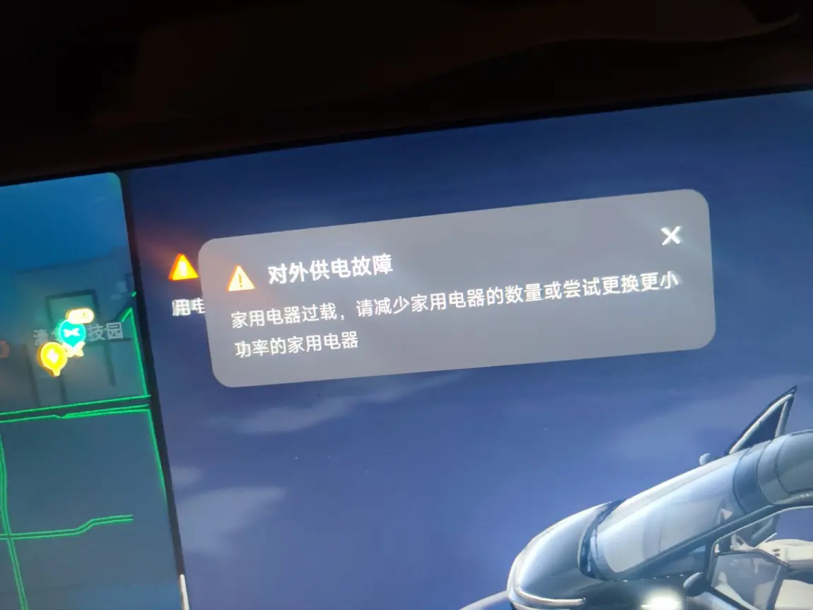 X9外放电我看最大支持3.3kw,我这个洗车机理论上是2kw按理说功率在范围内,应该没问题,结果实际情况是我把洗车机接上X9总出现如下过载保护的提示。