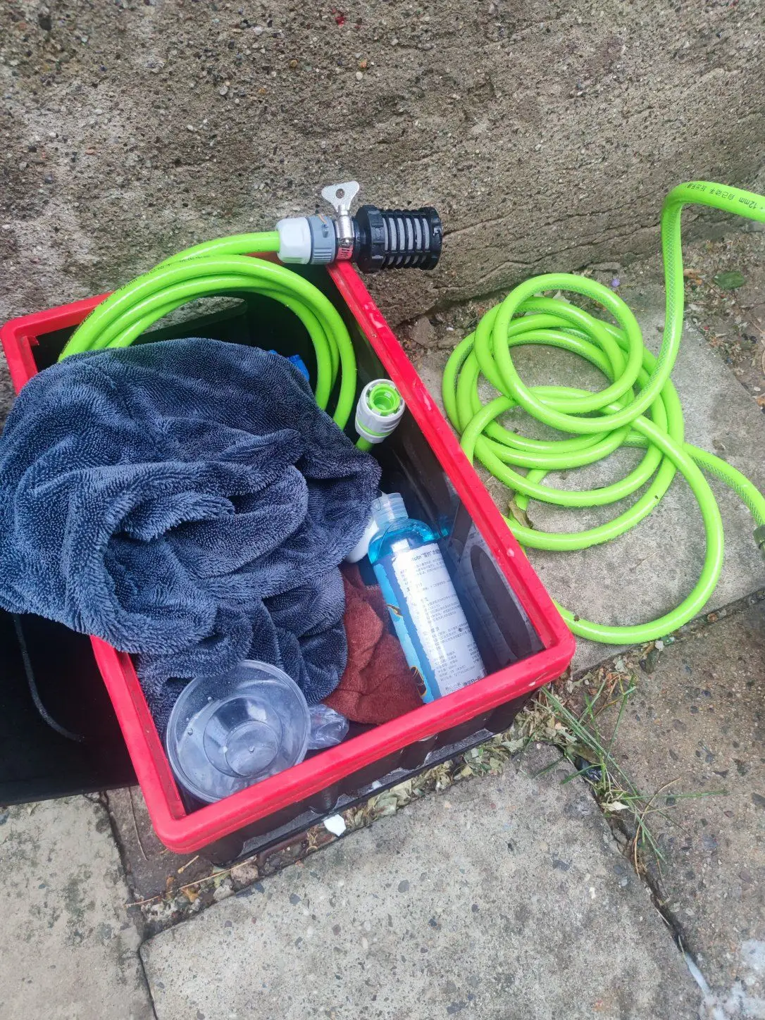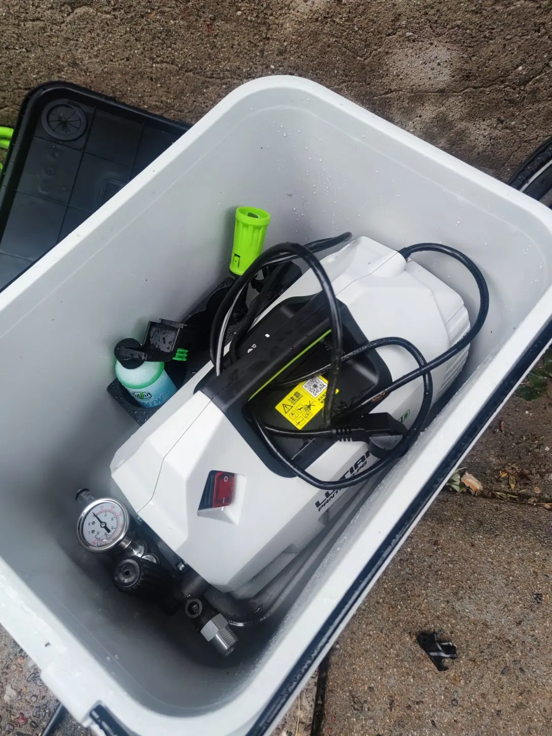 家住老破小,用洗车机主要解决电和水,我原本的计划是用X9的外放电进行洗车,然后用一个35L的移动水箱解决水。东西都准备好了,但外放电出了点岔子。