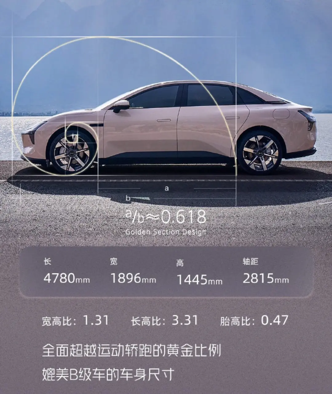 小鹏M03的0.618黄金车身比例,全面超越运动轿跑的黄金比例,媲美B级车的车身尺寸。
