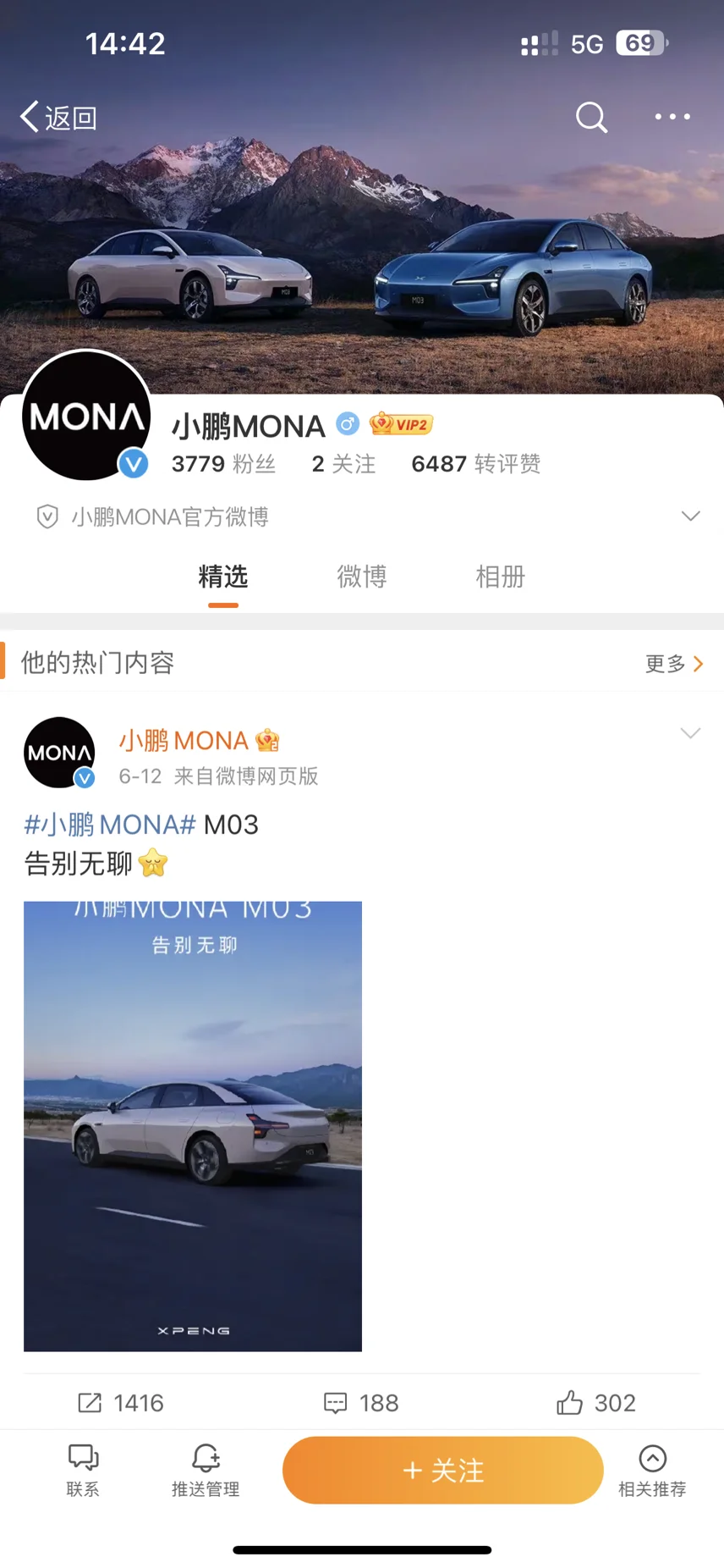 #小鹏MONA M03颜值美学# 小鹏今年第三季度全面推进mona全新美学设计开启,小鹏mona围脖账号正式启用。