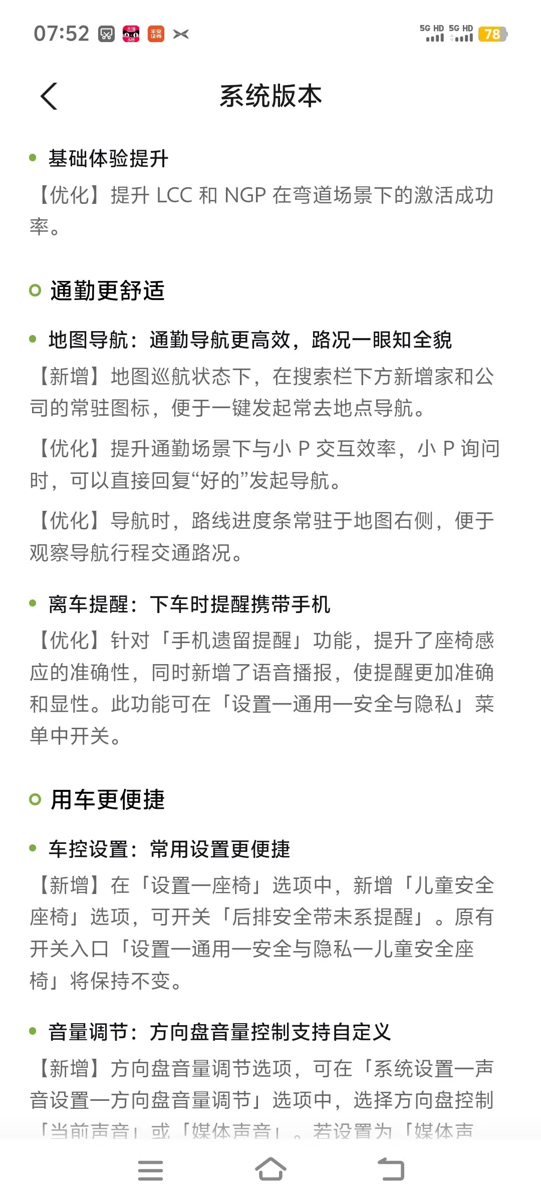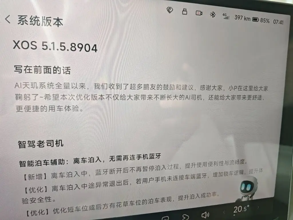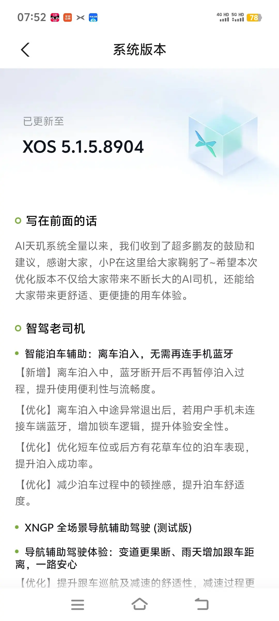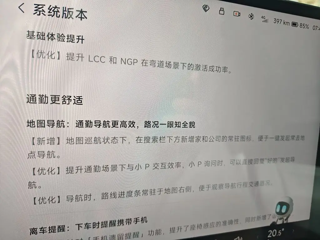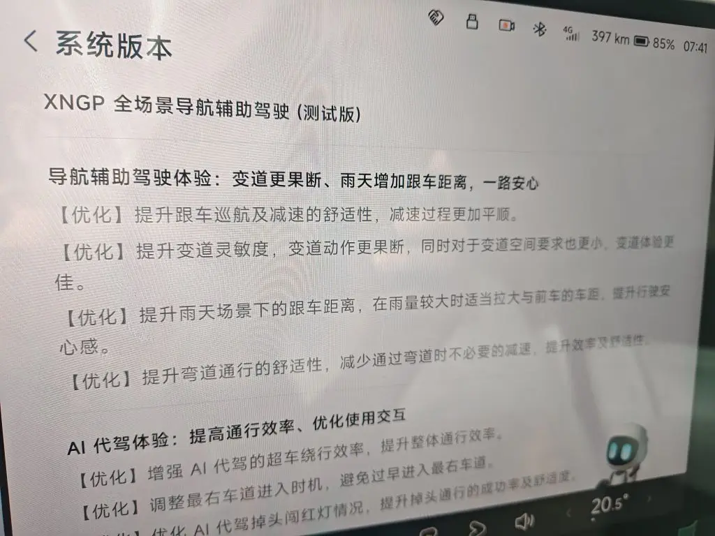 看完英格兰跌跌撞撞的比赛,手机app提示我系统早已经提示升级完成了。今早开车上班,车屏幕也弹窗提示天玑系统已经更新到5.1.5版本,具体升级的内容车屏幕和手机上都有详细的说明,涉及AI离车泊入、AI代驾、XNGP智能辅助驾驶、音量调节、浏览器……各个方面,升级的地方还是不少的。尤其浏览器,支持钉钉打卡了,这样就方便出门稍晚的车主在车上就可以完成考勤打卡了,真是很有帮助的升级点。