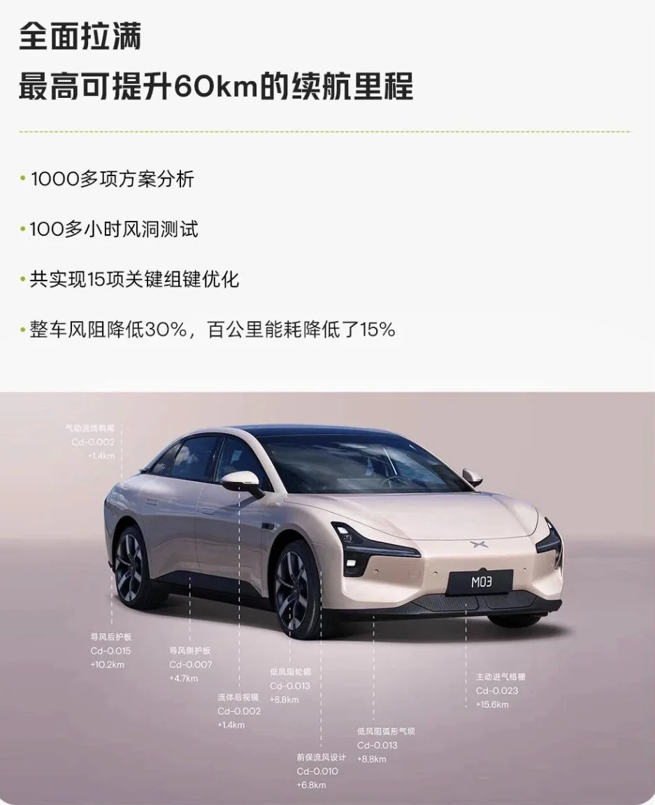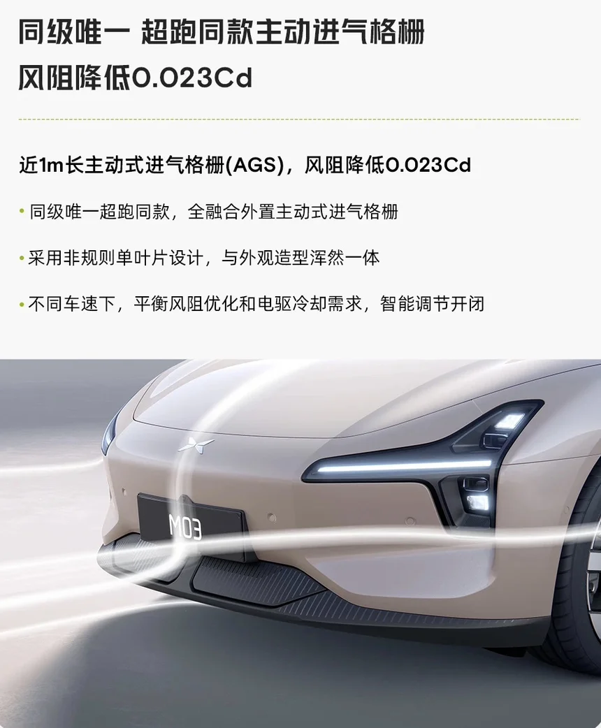 日前,我们从官方获悉,小鹏MONA M03的风阻系数仅为0.194,拥有全球量产纯电掀背轿车中最低的风阻系数。据悉,新车搭载了全融合主动式进气格栅,可以根据车速智能调节开闭,打开时可以增强电机散热,关闭后能够提升风阻表现。