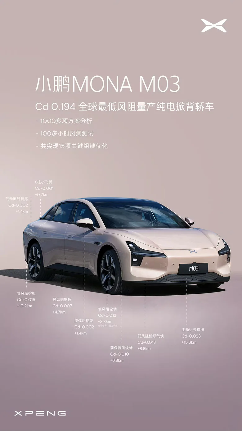 成为新能源车主后,对车辆的能耗颇感兴趣,低能耗不仅仅需要三电做得好,风阻也是关键因素之一,这次借小鹏MONA M03上市之际,聊聊鹏厂的鬼斧神工将风阻系数做到0.194Cd