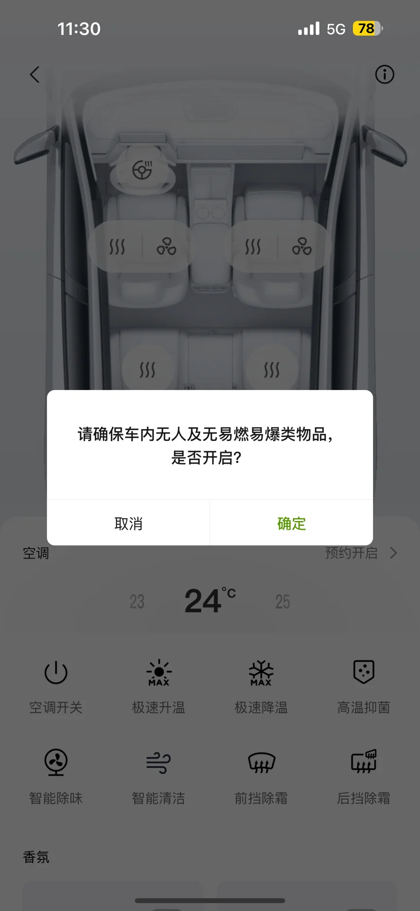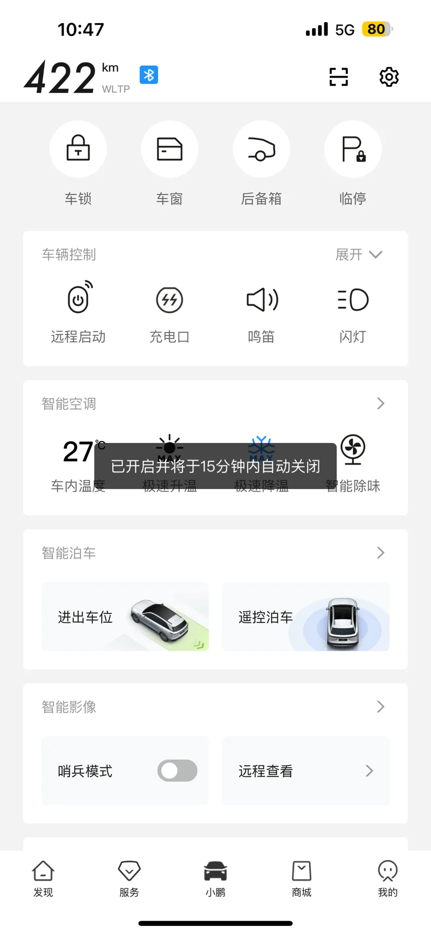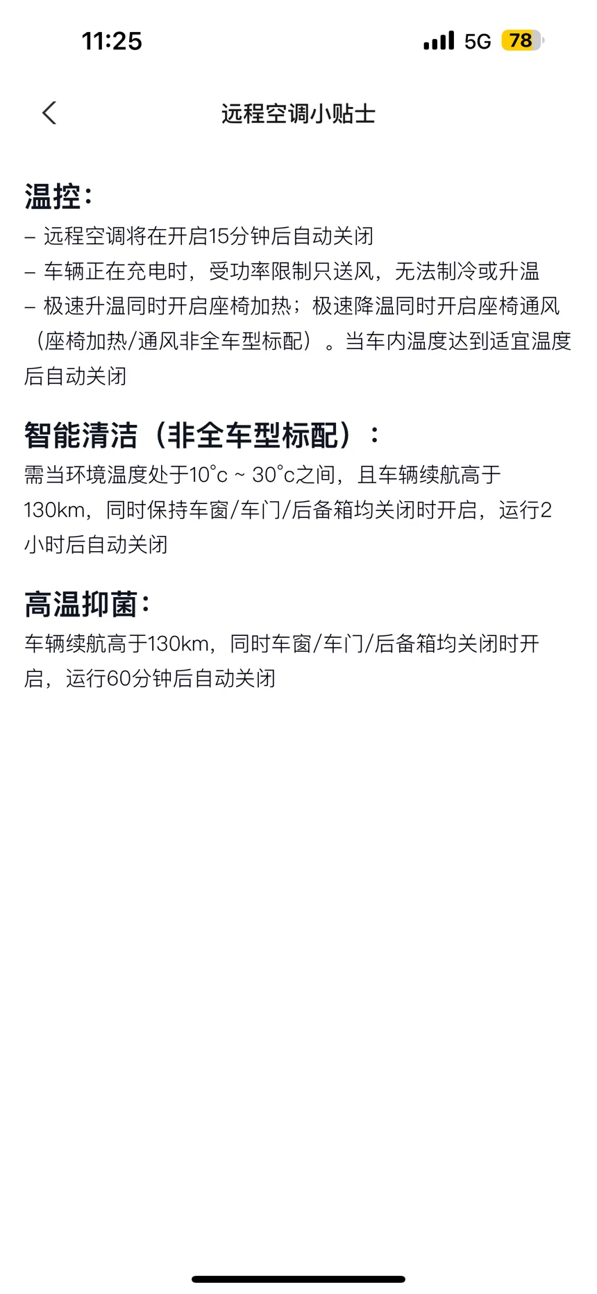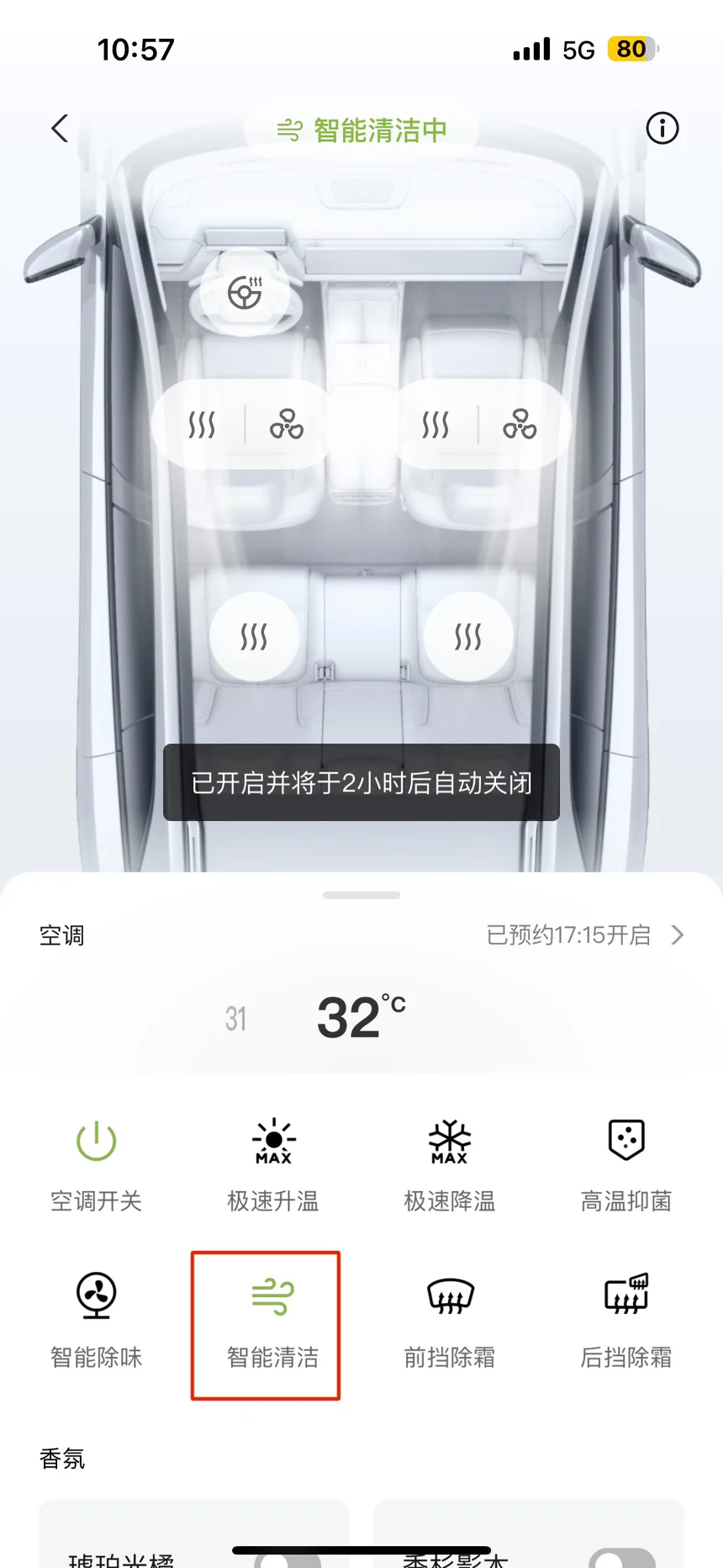 注意:智能清洁并不是全系标配的功能,如果有些鹏友们没有这个功能就可以手动开启智能除味 等15分钟运行结束后在手动开启高温抑菌(同样车内不能有人或者易燃易爆物)也可以达到智能清洁的效果
