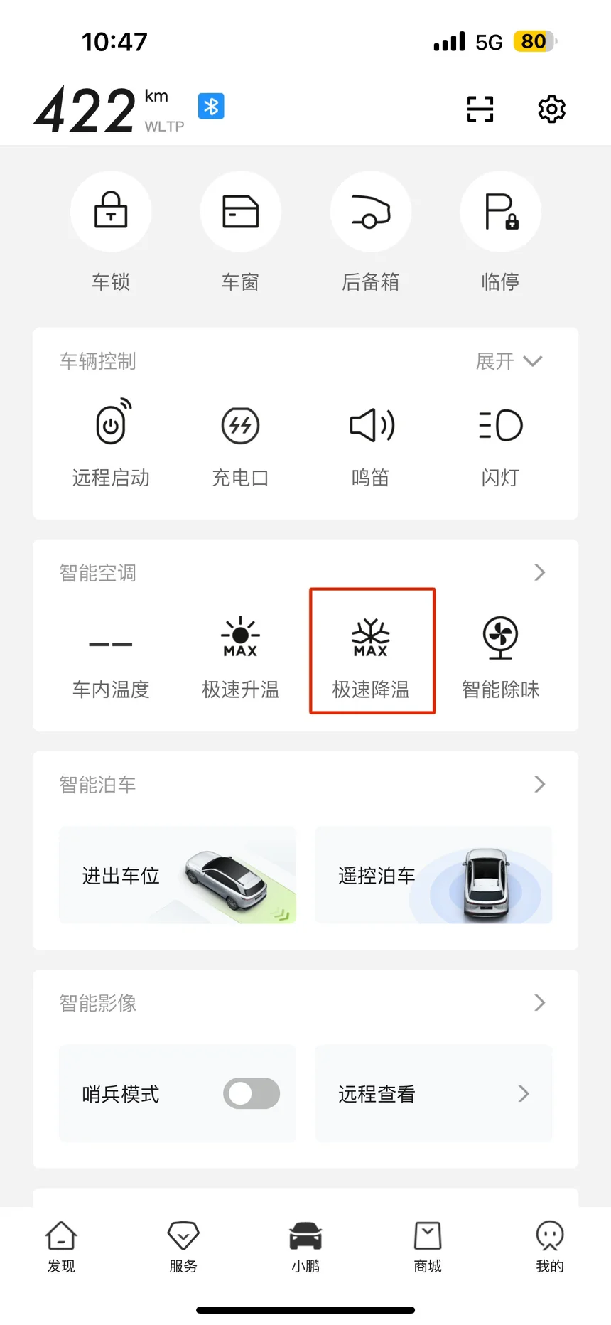 最简单也是最直接的就是打开我们的小鹏APP在智能空调这里直接点击极速降温就行了,显示车内温度有数字就代表改功能以正常开始🔛但是作为智能电动化车的车主肯定不想自己每次上车前还要手动打开APP去操作 这样显得太不高级了 接下来看我继续操作⬇️