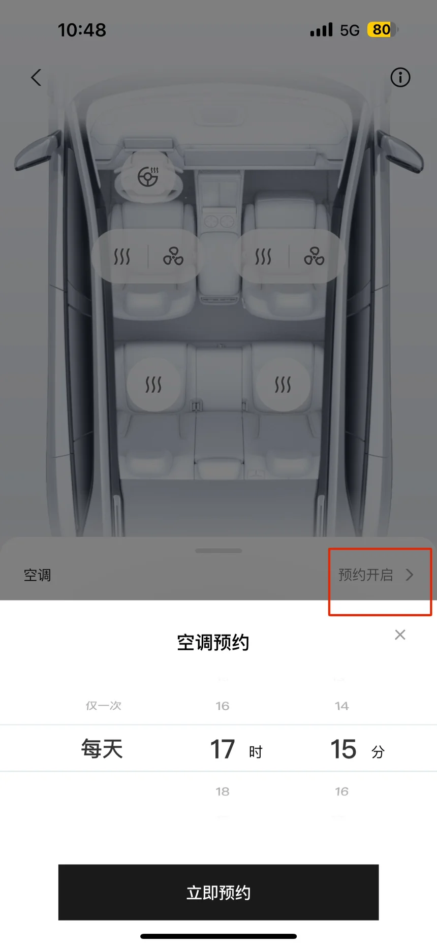 这对于有着固定时间上下班的鹏友们是一个不错的选择 可以更具自己下班点前15分钟设置极速降温的时间,这样等下班上车后就能直接很舒适的进入车内 不用等上车后在把空调设置最低温度风量开最大车窗全部打开去降温,相对打开APP去点击来说是高级了一点省去了拿出手机去操作的烦恼