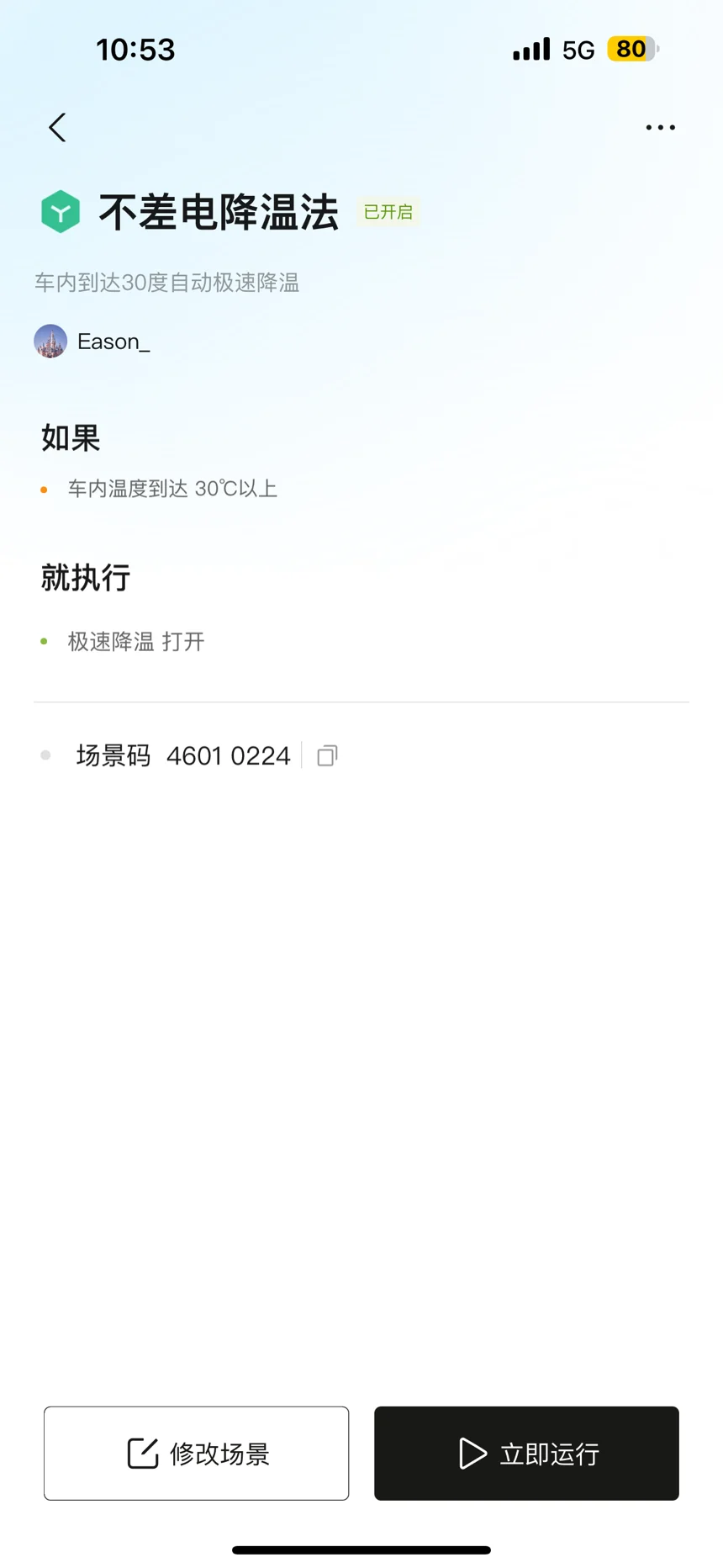 以上是我自己总结的一些夏日用空调的办法,对于我这个人来说 智慧场景是我最喜欢的降温办法 因为有的时候自己肯定会忘记去手动开启极速降温 但是智慧场景不会忘记我和他之间的约定😄他会每天都帮我达到合适的温度后等着我下班 让我舒舒服服的开车回家👏