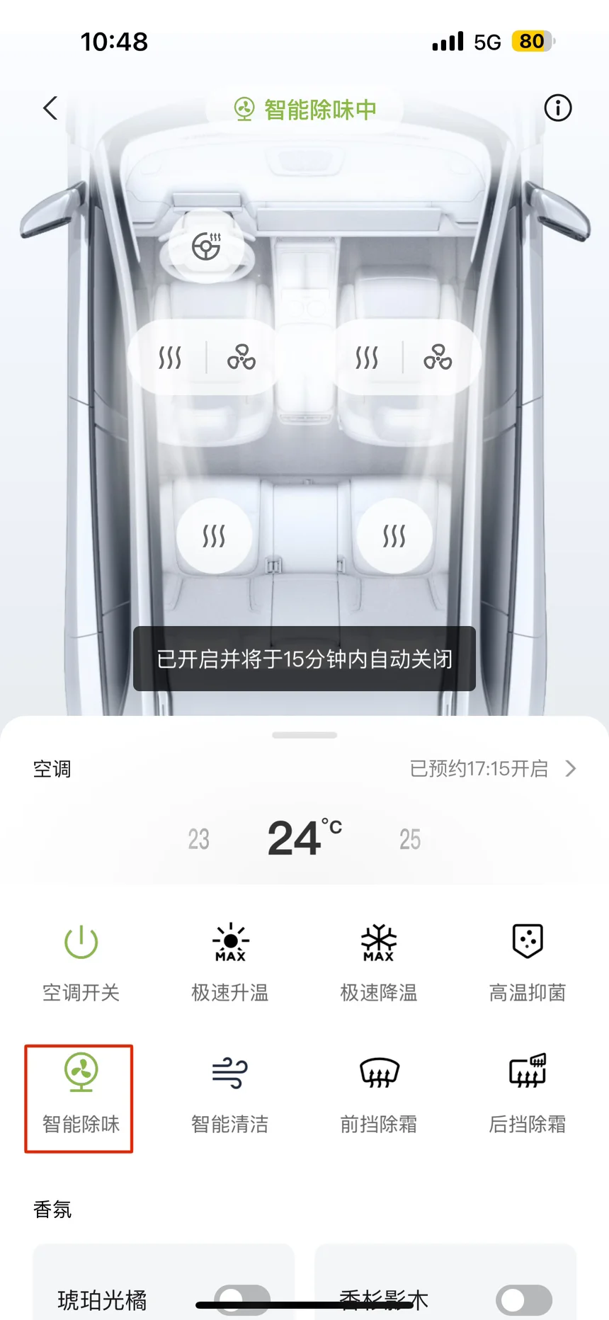那么在车辆长时间开空调的情况下 同时又不愿意选择开窗通风的时候车内难免会有一些异味在车内一直出不去 那这个时候就可以打开我们的智能除味 车辆空调会自行运行15分钟 对车内异味经快排出从而使得我们车内空气清新不会产生过大的异味