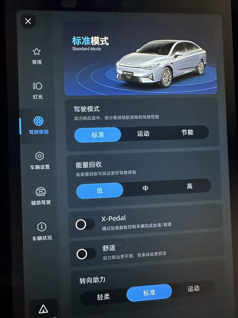 首先,我个人一直驾驶的模式是用标准,而能量回收调低的级别,而转向动力调标准。