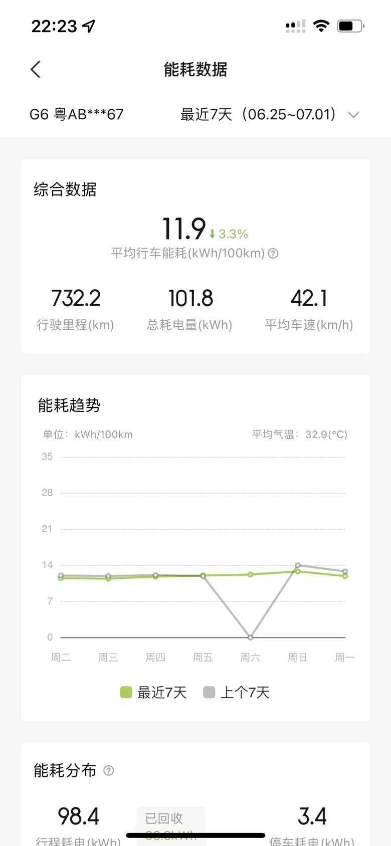 而在我自己最近7天的用车中,高温天气,空调也得调低一点,一般在21度左右,但G6的电耗并没有太大的影响。