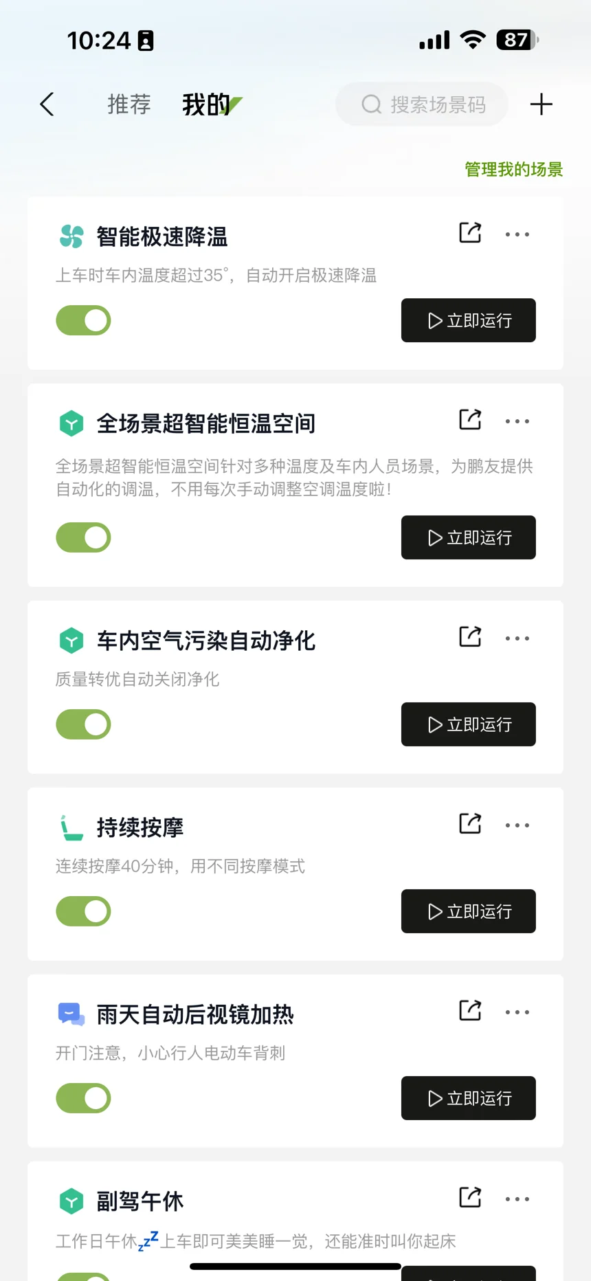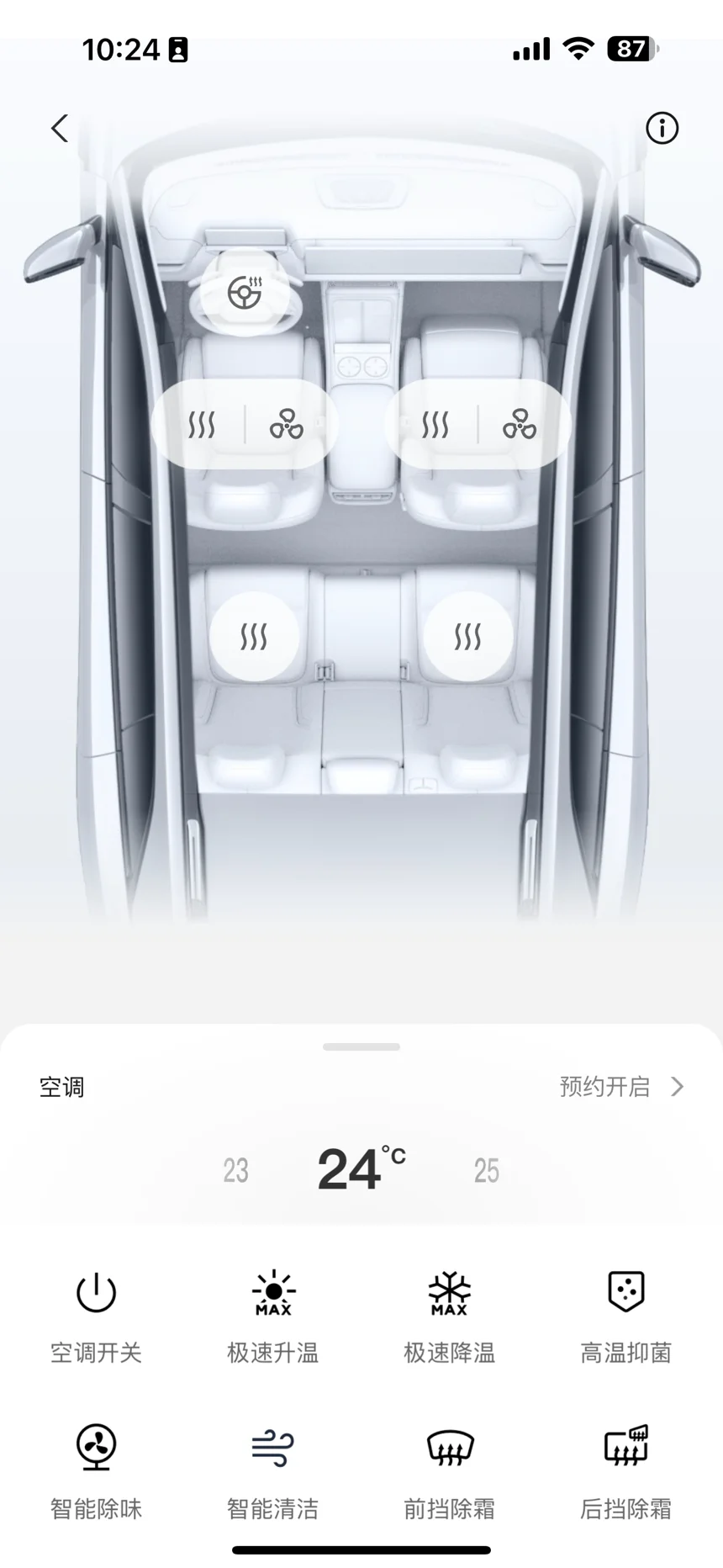 上车后可以将前挡出风打开,可以将冷气吹到车顶,降低顶部温度,起到快速降温的效果。自己可以设定夏季的智慧场景,可以更加智能便捷。