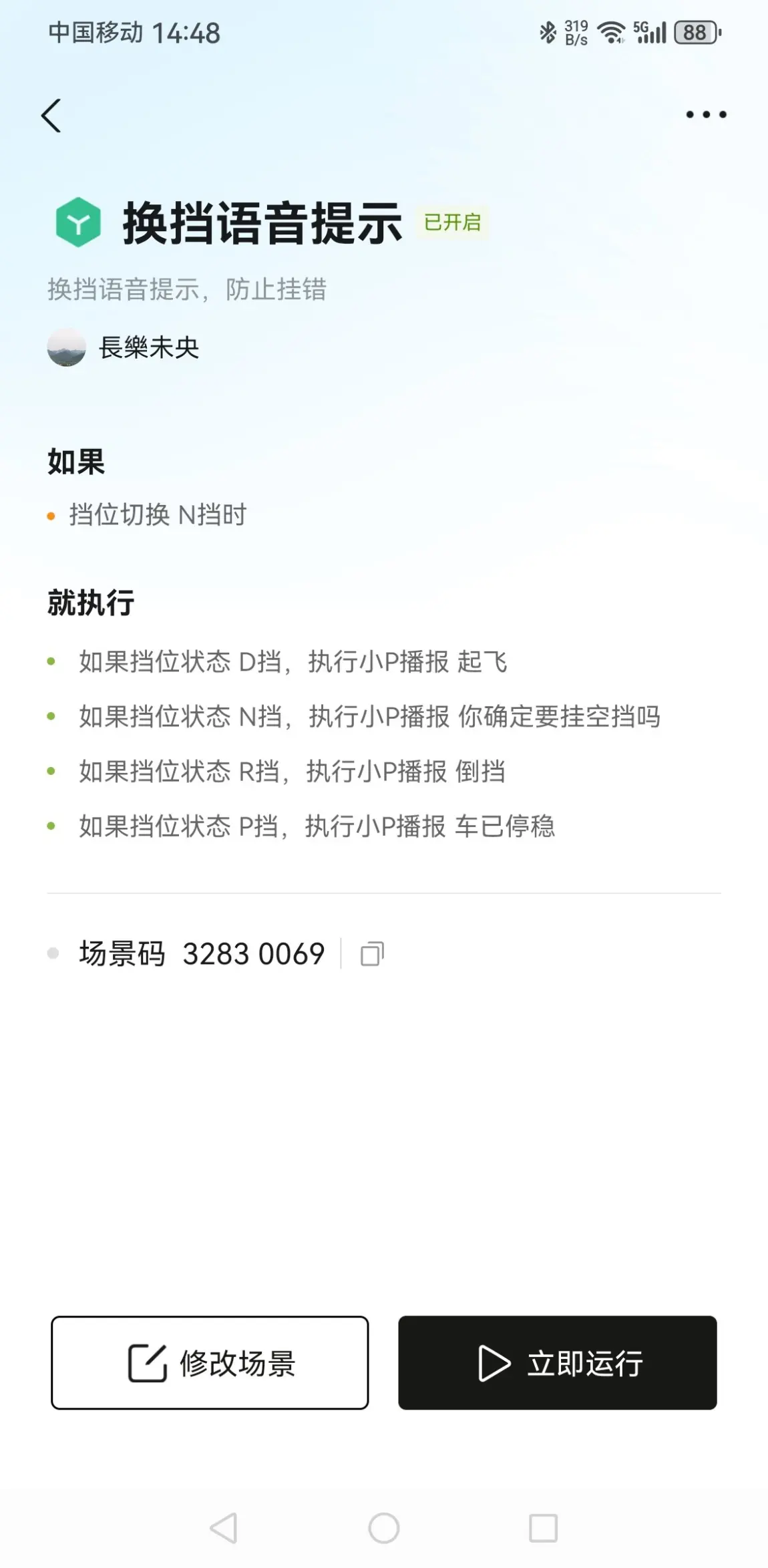 智能场景鹏友们可不要忽视了,这个可是个法宝。我设置了档位变换的场景,可以有效预防挂错档位的情形。另外诸如空调,座椅位置,上车音乐等大家也可以根据需要研发。