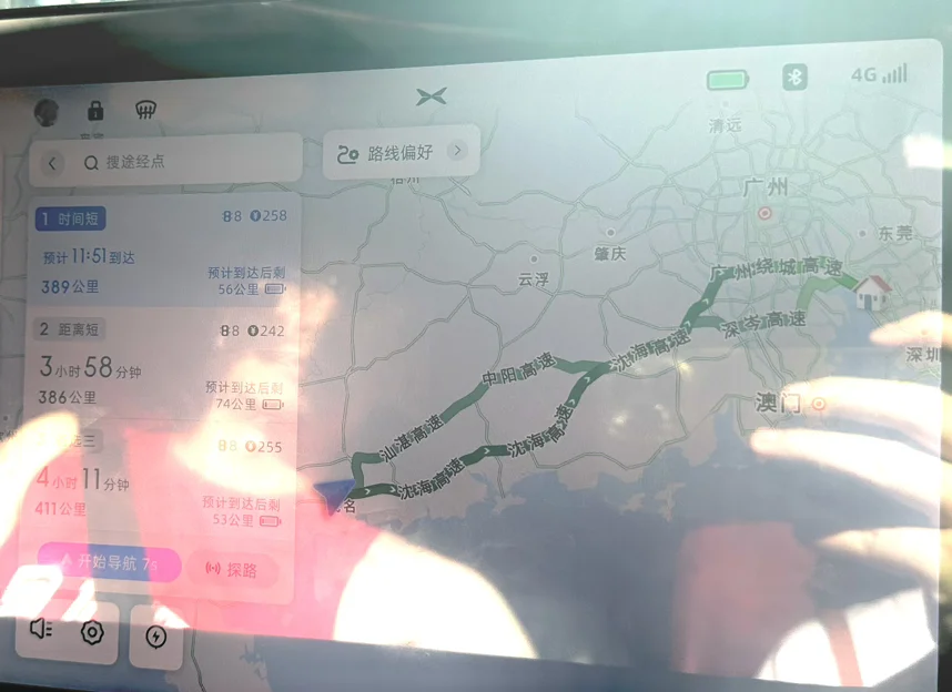 1️⃣路线规划:在出发前选择了一条距离最短的路,并且时间用时也是最短的。从茂名到深圳走主要走沈海高速,然后有一小段是广州绕城。中控大屏上显示中午11点51分到(出发前设是早上8点整),到达之后还剩56公里续航。佩奇的预估续航还是挺准的,至少用车两年多以来,基本上到达剩余电量只有超出的,没有预估少的。
