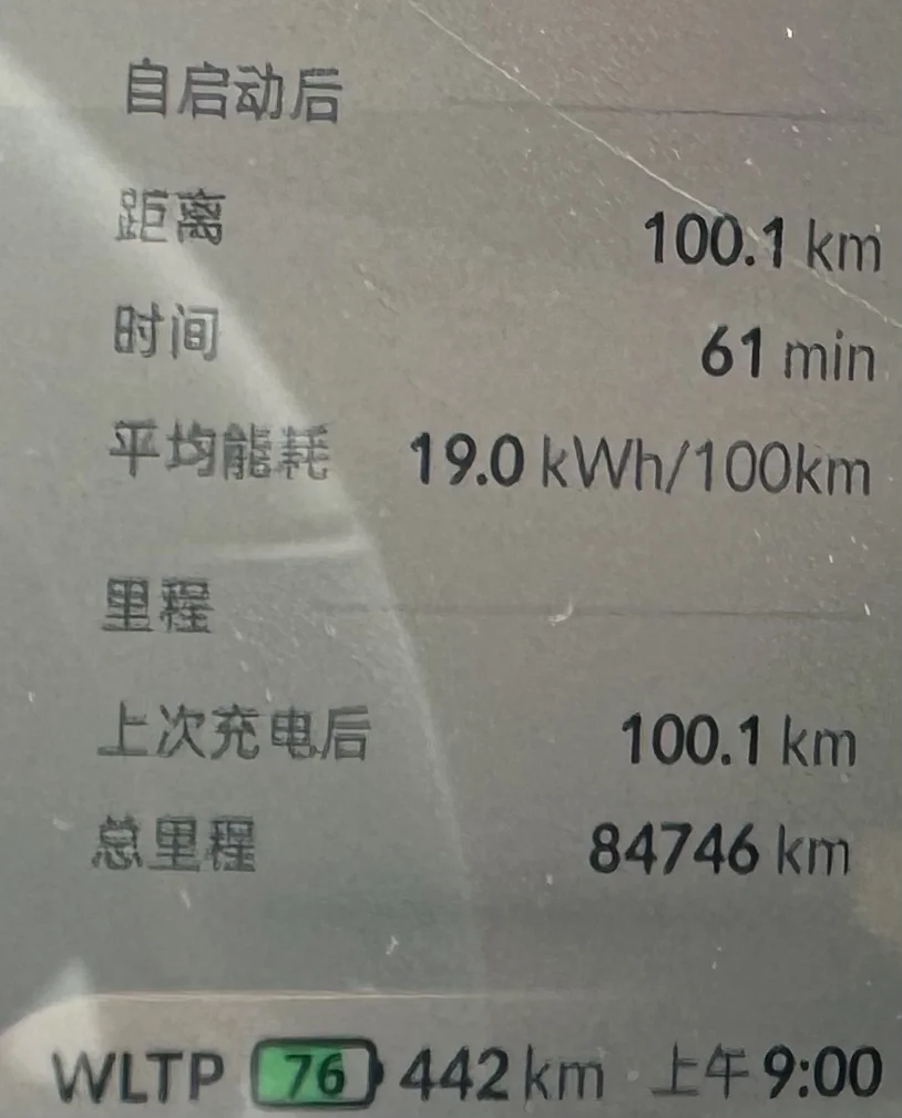 到了9点整,正好行驶了100公里,前面有5公里国道还有几个红绿灯,所以这样算下来平均速度是100公里。能耗上到了19.0也属于正常。电量也剩余442公里,出发前576-442=134公里。续航打折率在七五折。