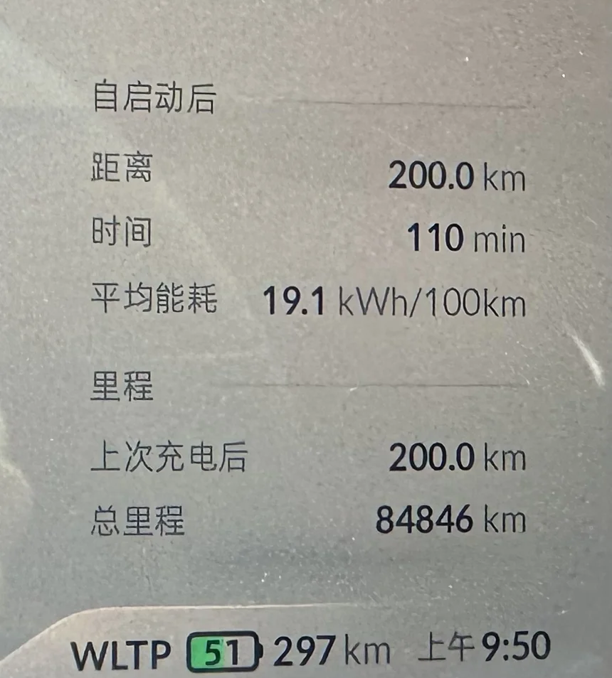 9点50分,正好是又行驶了100公里,一共行驶200公里,着一百公里平均速度也正好是130,所以总结出50分钟走了100公里,能耗在19.1,电量剩余297公里,算下来这一百公里130的速度,续航打折率在六九折,总的续航达成率在七二折。因此,这段100公里的电耗和续航达成率是极具有参考价值的。