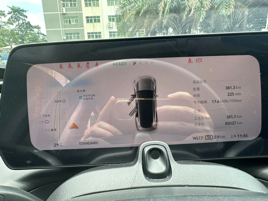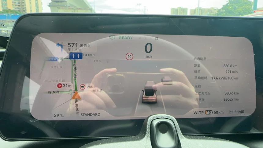 11点40分又过了差不多1个小时,下高速了。下高速后马上就等了红绿灯,这时仪表盘上显示走了380.6公里。电量正好到了黄色预警,剩余60公里续航。