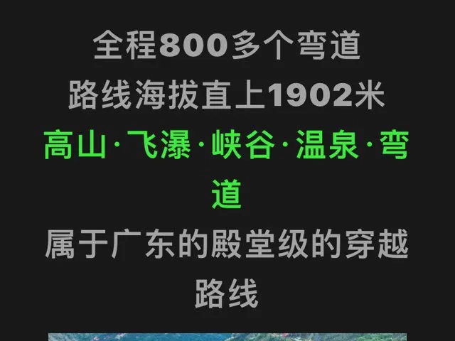 #鹏友来出题,你说路线我挑战# 全程800多个弯道路线海拔直上1902米高山·飞瀑·峡谷·温泉·弯道,属于广东的殿堂级的穿越路线它蜿蜒盘旋于崇山峻岭之间。又称“广东人的科目五”,全长38公里,海拔从200米提升至1902米。全程共有800多个弯道,大约平均每47米就有一个弯道沿途奇峰耸立,溪水潺潺,秀丽风光让人流连忘返。一路穿行于蜿蜒盘旋的高山峡谷中,翻山越岭,让人胆战心惊。很考验您的驾驶技术,一路上带给你的惊喜程度不亚于川藏线318,在山顶还能体验一脚踏两省