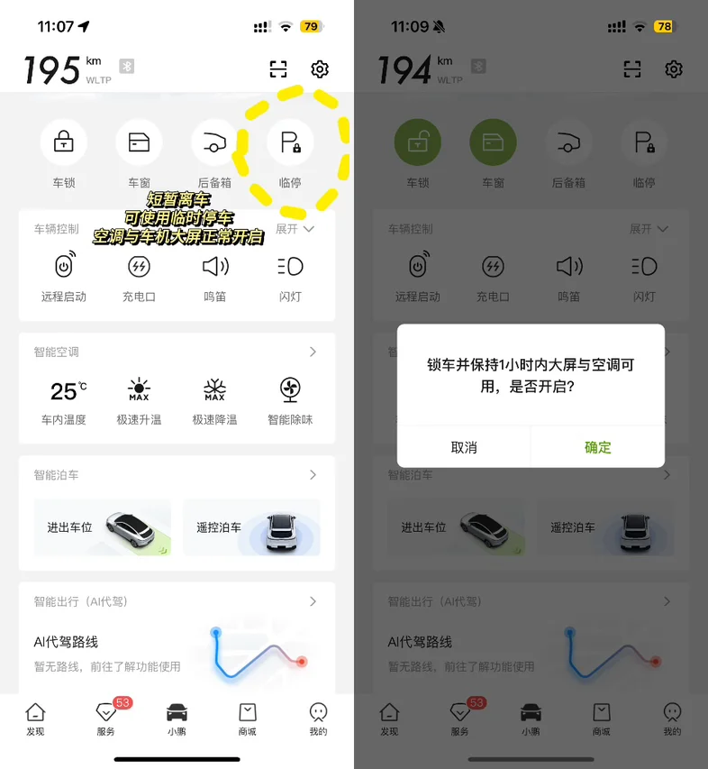 2️⃣临时停车在小鹏汽车车控App界面有个临停按键可锁车并保持1小时内大屏与空调可用这样短暂离车(如停车买咖啡☕️)返回车内时依然凉爽