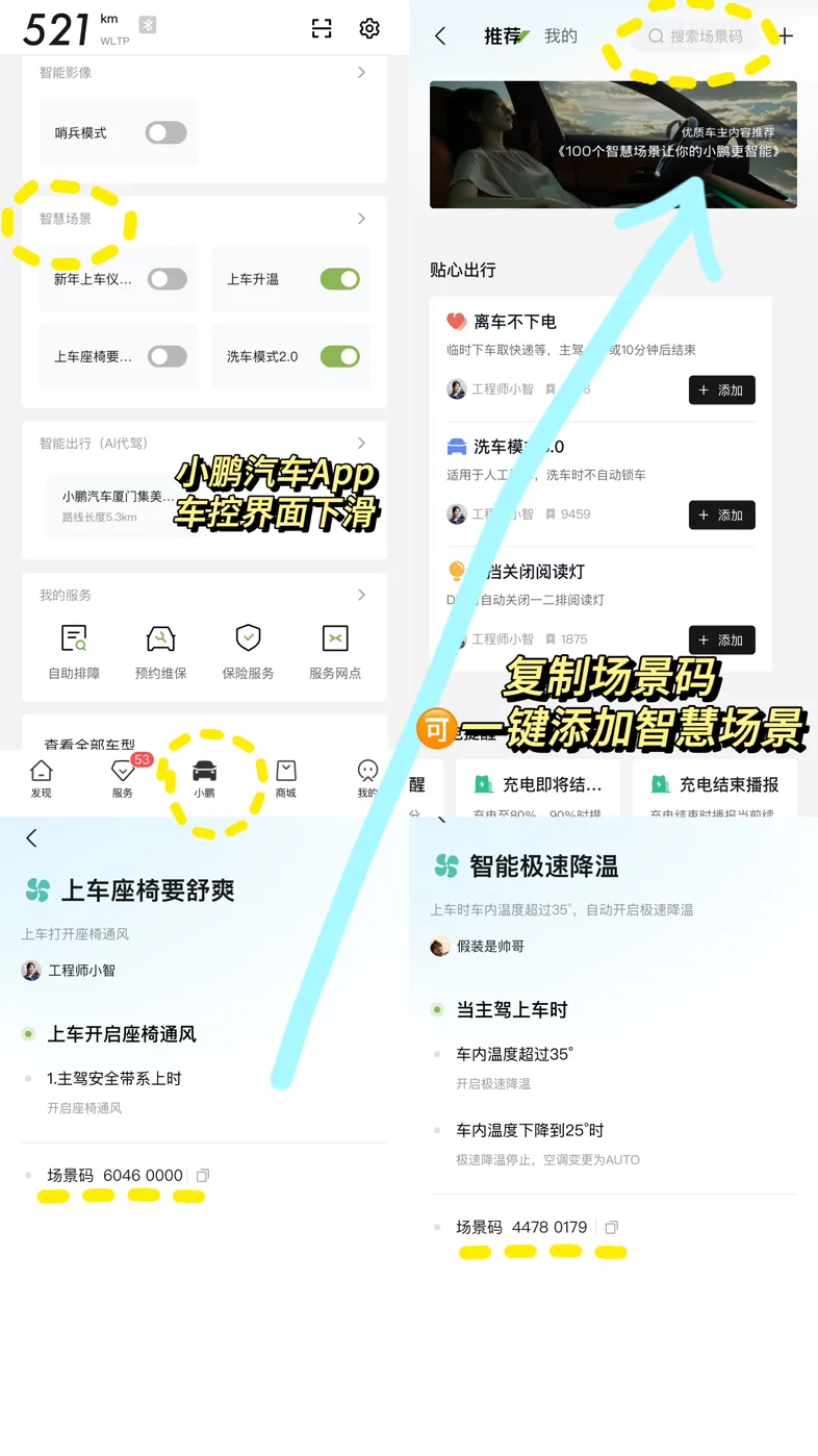 3️⃣智慧场景💡可根据自身需求 设置智慧场景触发条件使用车更加便利🤗同时~鹏友之间智慧场景可通过场景码共享哦!