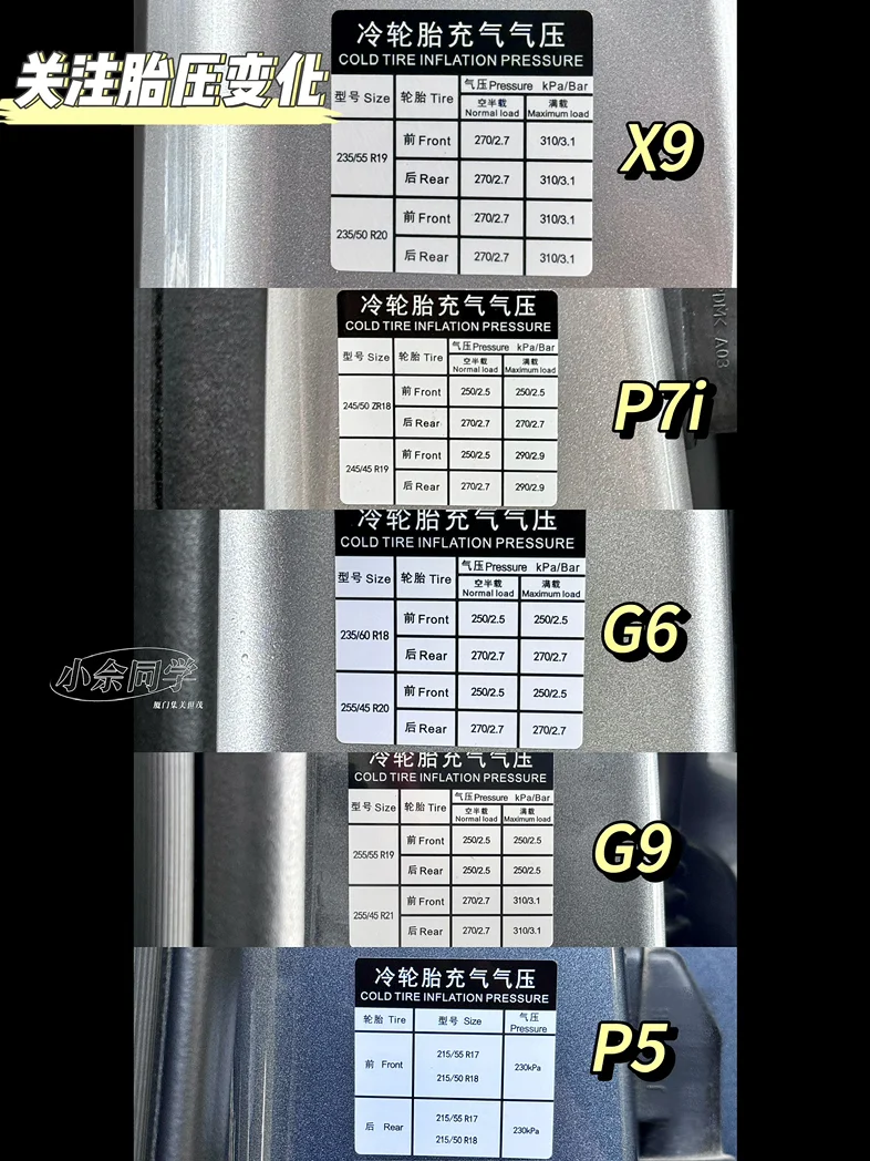 4️⃣关注胎压变化各车型胎压建议值已帮鹏友们整理好啦!夏季高温会导致胎压变化胎压过高或过低都会影响行车安全和能耗