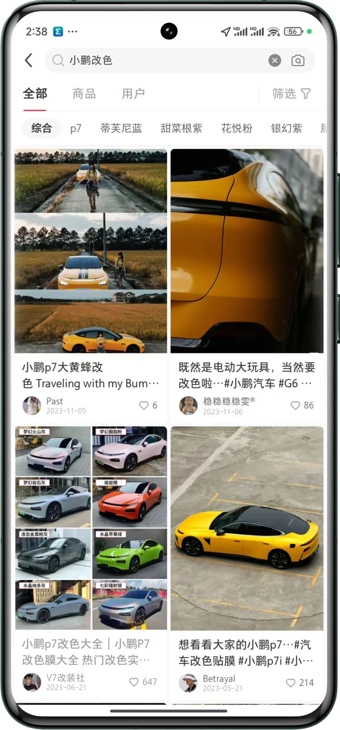 选色是一门技术活,首先要在网上看车友们的实车改色案例,建议去小红书上搜索“小鹏P7+你中意的颜色”就能出来很多实车照片,这样你就能很直观的感受改色后车辆的感觉,也可以在底下留言问问是哪个品牌,颜色名称或者代码是多少。