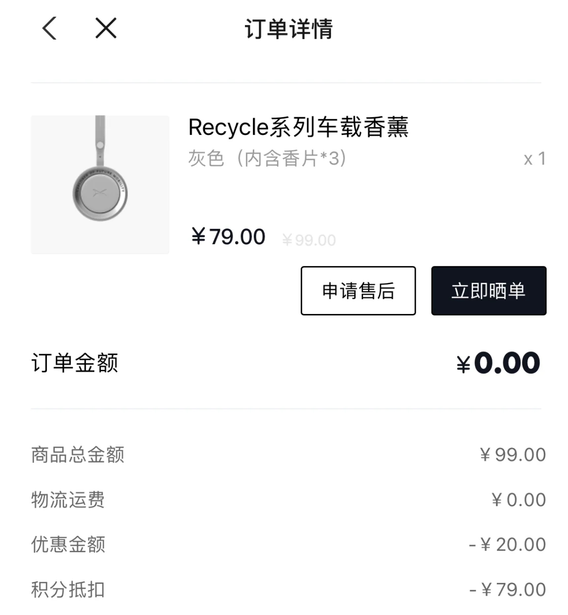 最近看中了小鹏商城里面这个香薰,在我拿到了签到赠送的二十元优惠券后,我果断购买上车体验。