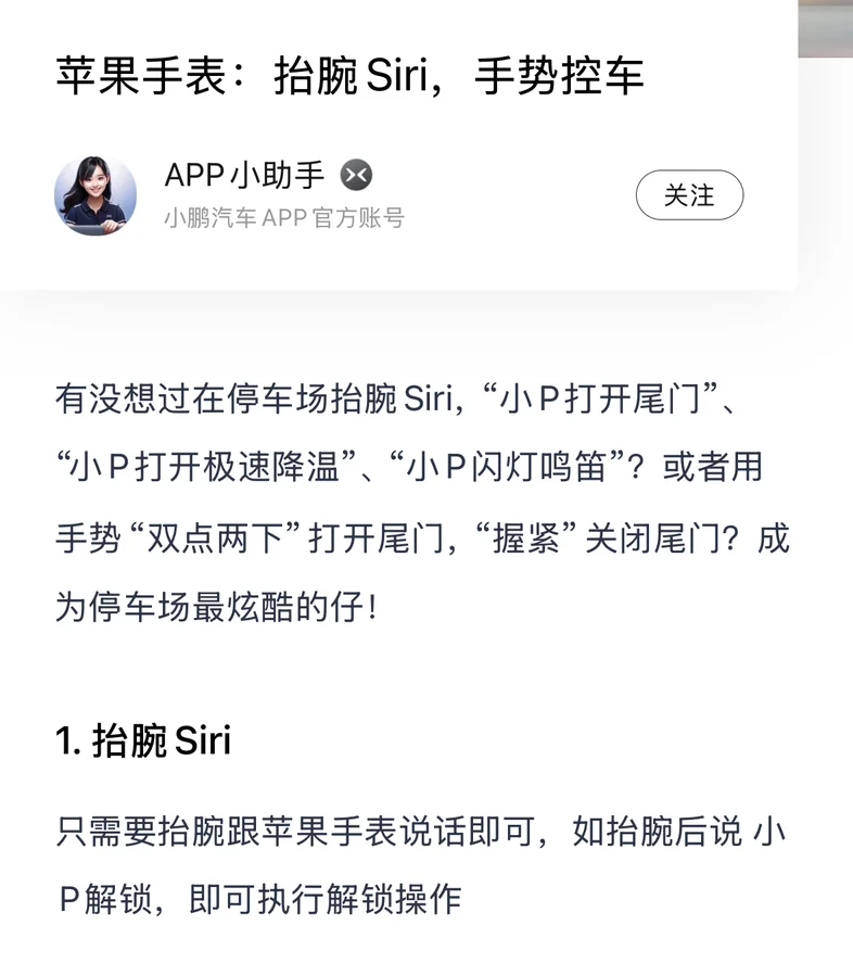小鹏 App 软件更新 新玩法见图一Siri➕小 P:多种唤醒功能,详见图二。手机 NFC 控车:多种快捷手机贴一贴,便捷控车,详见图三。Action Button 一键快捷:可以通过快捷指令搭配一键降温等功能。详见图四Apple watch 抬腕控车:可以进行抬腕 Siri 以及手势操作,内容见图五。灵动岛实时车辆状态:可以灵动岛显示更多车辆重要信息。内容见图六。详细操作见 App 内。