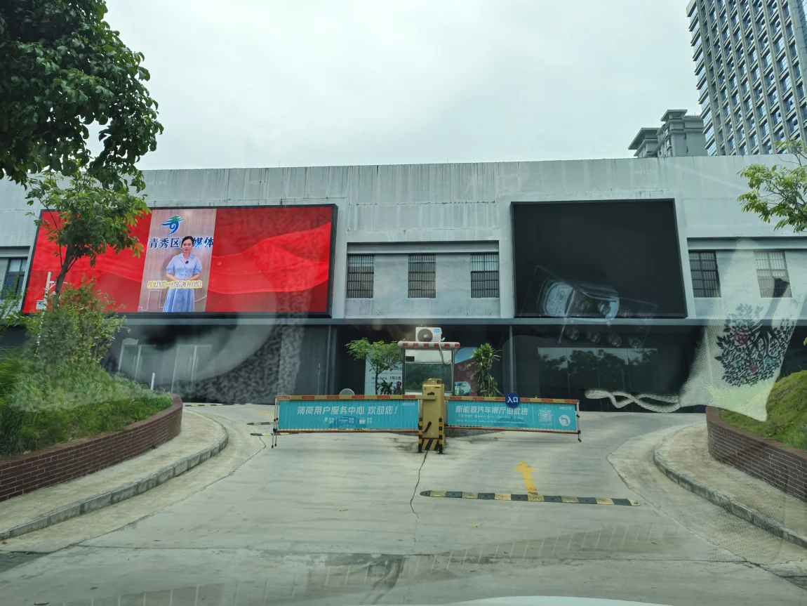 展厅的墙面上挂着三个大屏幕,我去的时候只有两个屏是亮的,上面滚动播放着有关南宁日报融媒体出品的宣传广告。同时,这个停车场和南宁日报社办公楼只有一道铁门之隔,如下图。