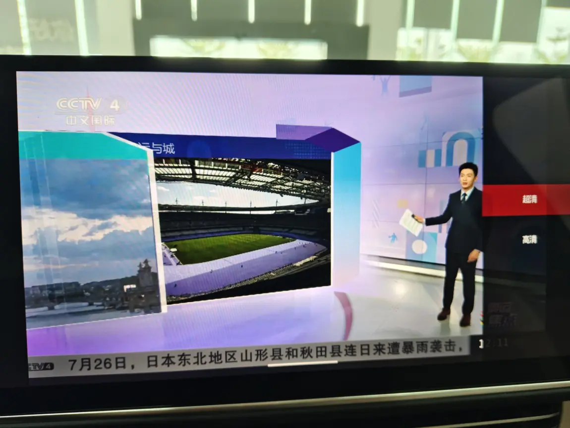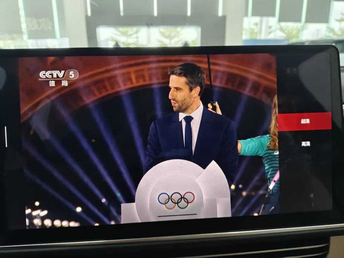 电视直播可以全屏,可以切换“超清”和“高清”两种分辨率,车主根据网络环境来自主决定。我在展厅看奥运开幕式比较流畅,用的是超清模式。