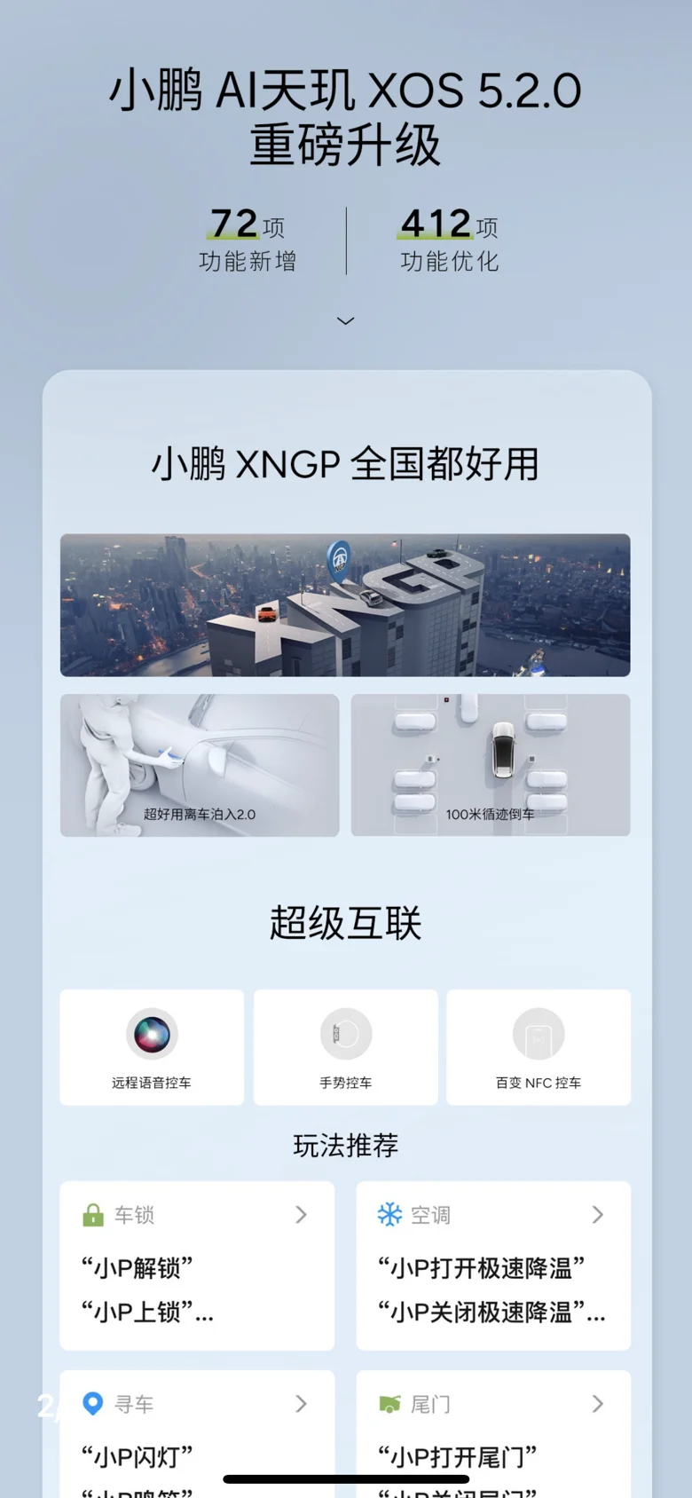 XOS 5.2.0版本不仅实现了与苹果生态的互联,更是加入了超多黑科技功能!远程语音控车、手势控车、百变NFC触碰控车……让你随时随地掌握车辆状态,享受前所未有的驾乘乐趣!
