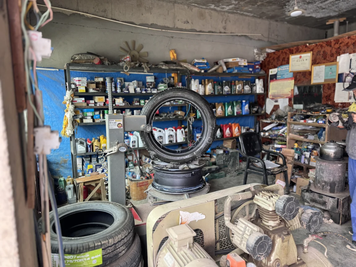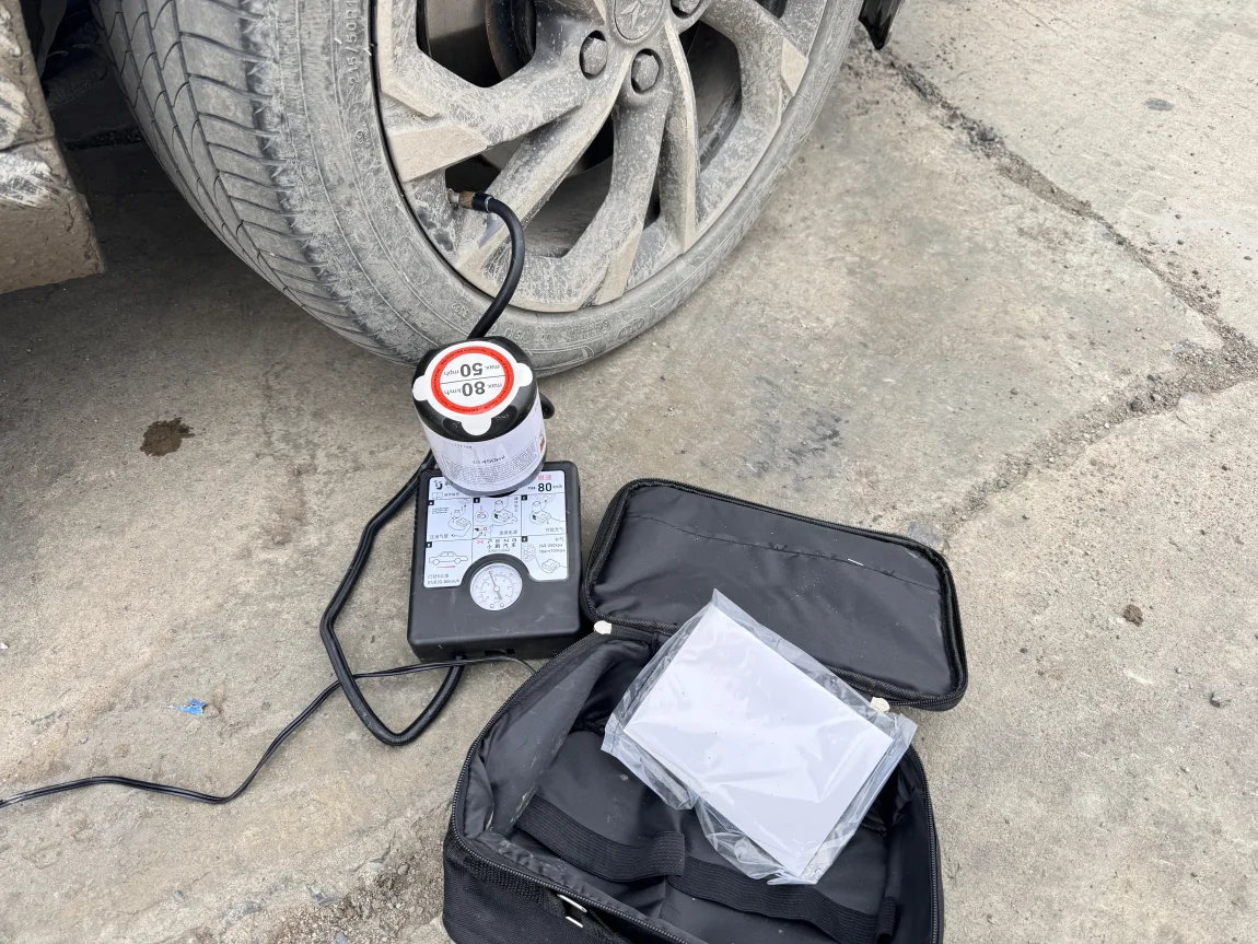 炮弹坑,两个洞,随车补胎没什么用,最后走15分钟补一次气,到了县城补胎。