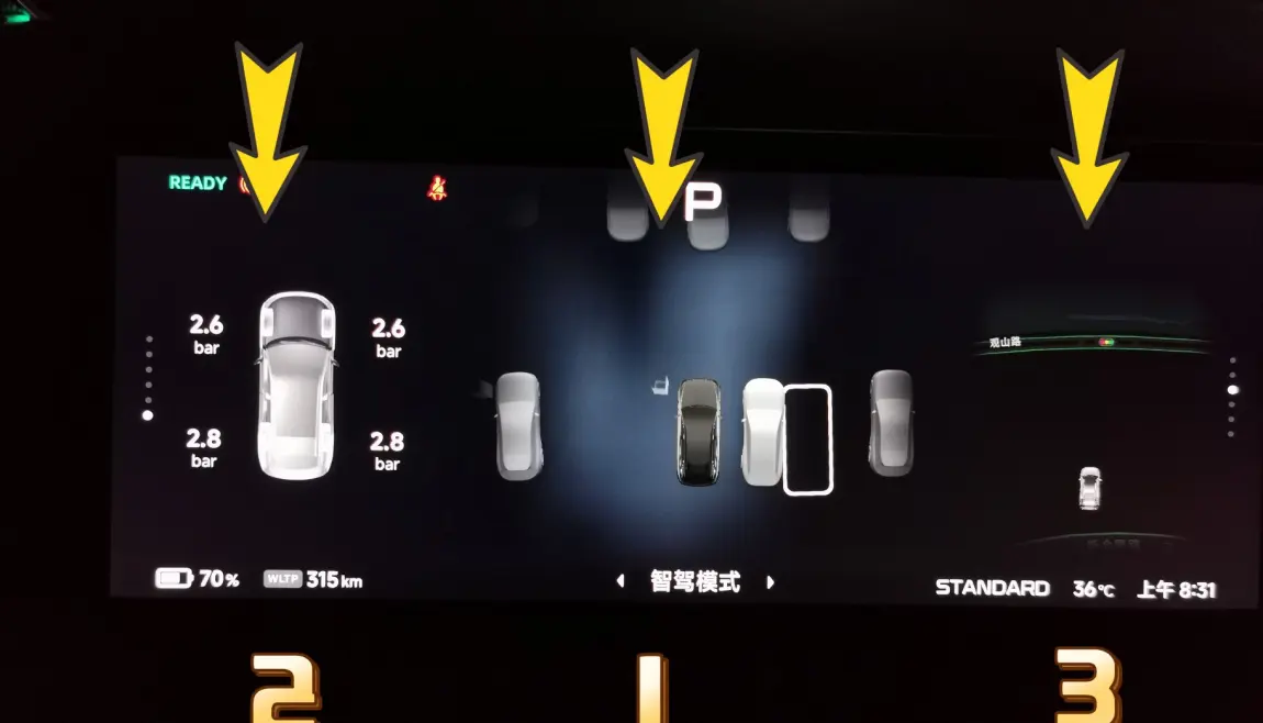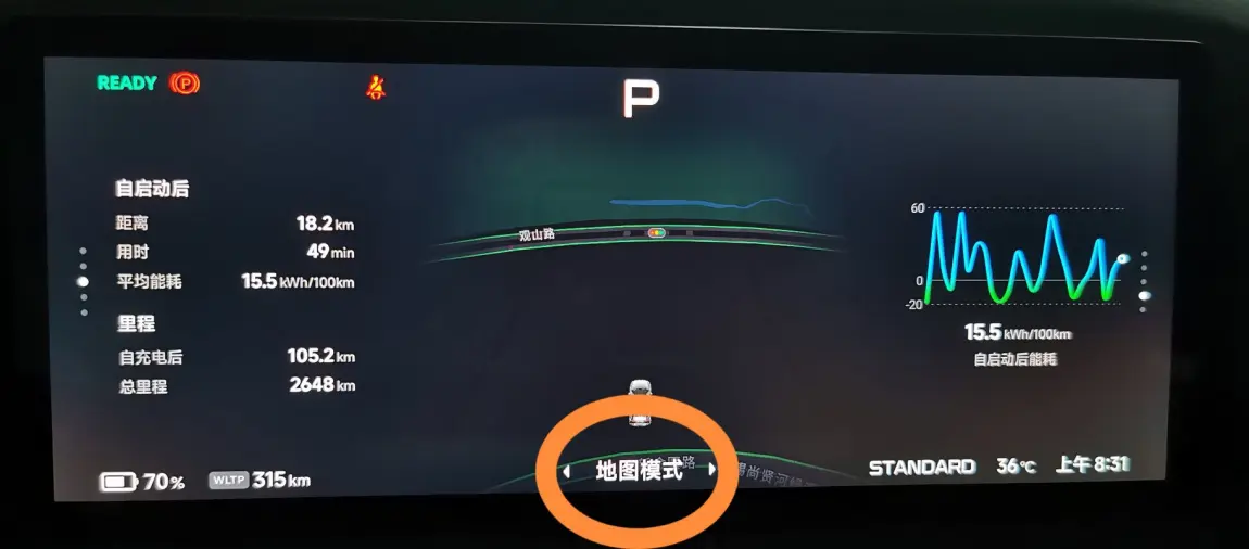 我们可以通过长按方向盘上的滚轮2-3秒,再按左右快捷按键来进行设置。仪表盘正中间显示区域,有两个显示内容,一个是地图模式,一个是智驾模式。