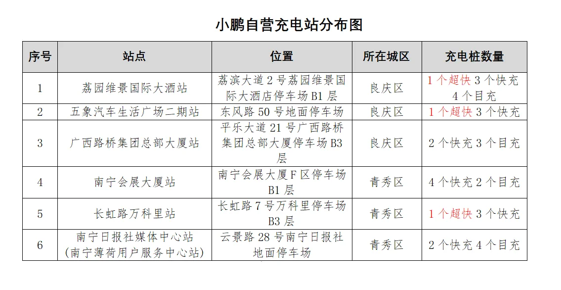 通过地图关键字“小鹏充电站”搜索,南宁市区内一共有8个自营充电站(鹏友可以看我之前发的“充电站打卡”系列文章),但是通过我上个月的逐一打卡,我确认有两处充电站位置是重合的,所以准确的说,小鹏超级充电站在南宁一共有六处,为方便统计,我做了一个表格(如下图所示)。