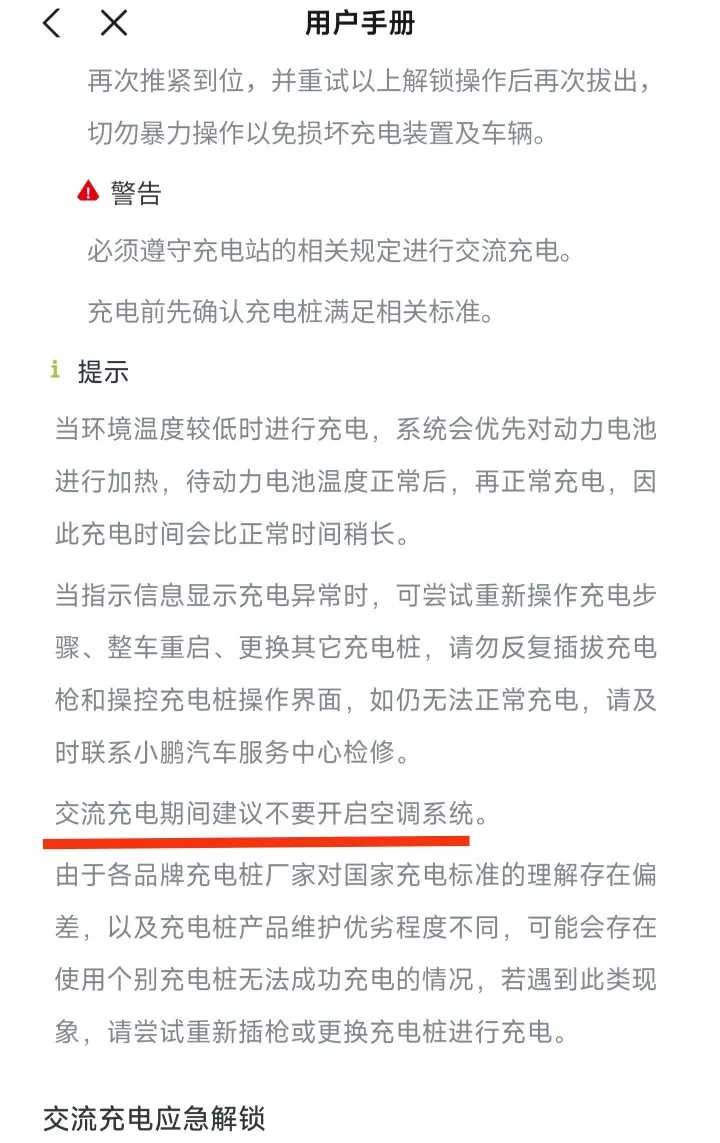 夏季和冬季,是新能源用车中两个较为极端的场景。夏季高温和暴雨对电车还是有很大影响的,但我们也不必过于忧虑,我觉得充电最好的还是听从官方用户手册的建议来操作。比如充电时能否开空调,官方手册里写的是交流桩充电时不建议开启空调,对于直流的快充并没有强调,有担忧的鹏友可以直接问问官方客服。