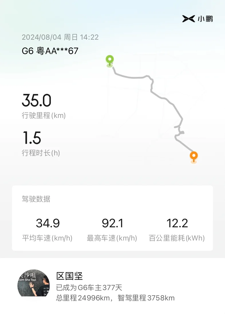 佛山的周末接近40度的高温火烤,幸亏当初在油车和电车之间选择了电车,不然上车肯定会烫屁股,现在开着G6,临出门前开极速降温,等几分钟再进车里,舒适性拉满!从西樵出发到顺德龙江的甘竹滩,全程35公里,表显电耗12.2,表显室外温度曾高达42度,前面几公里电耗一直都是接近20,后面开久了慢慢降低到12左右,能耗十分满意,这种高温天气,能耗确实是超乎我的预期,空调23度,自动(5-7档风)座椅通风全开,后排空调全开!