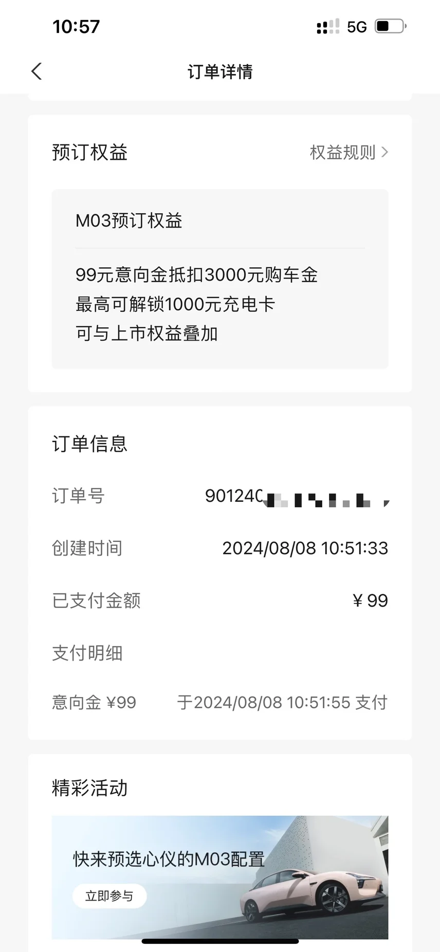 预订过程简单流畅,只需要填下自己的姓名和证件尾号选择好门店,便可以生成订单,销售同学也是很认真的耐心的跟我一一解答,让我这个老车主感受到温暖,我仿佛已经能预见自己开着MONA M03在路上,吸引一大片路人的眼球,我就是这条gai最靓的仔,我相信,在未来的日子里,它一样可以陪我一起去探索更美好的未来!