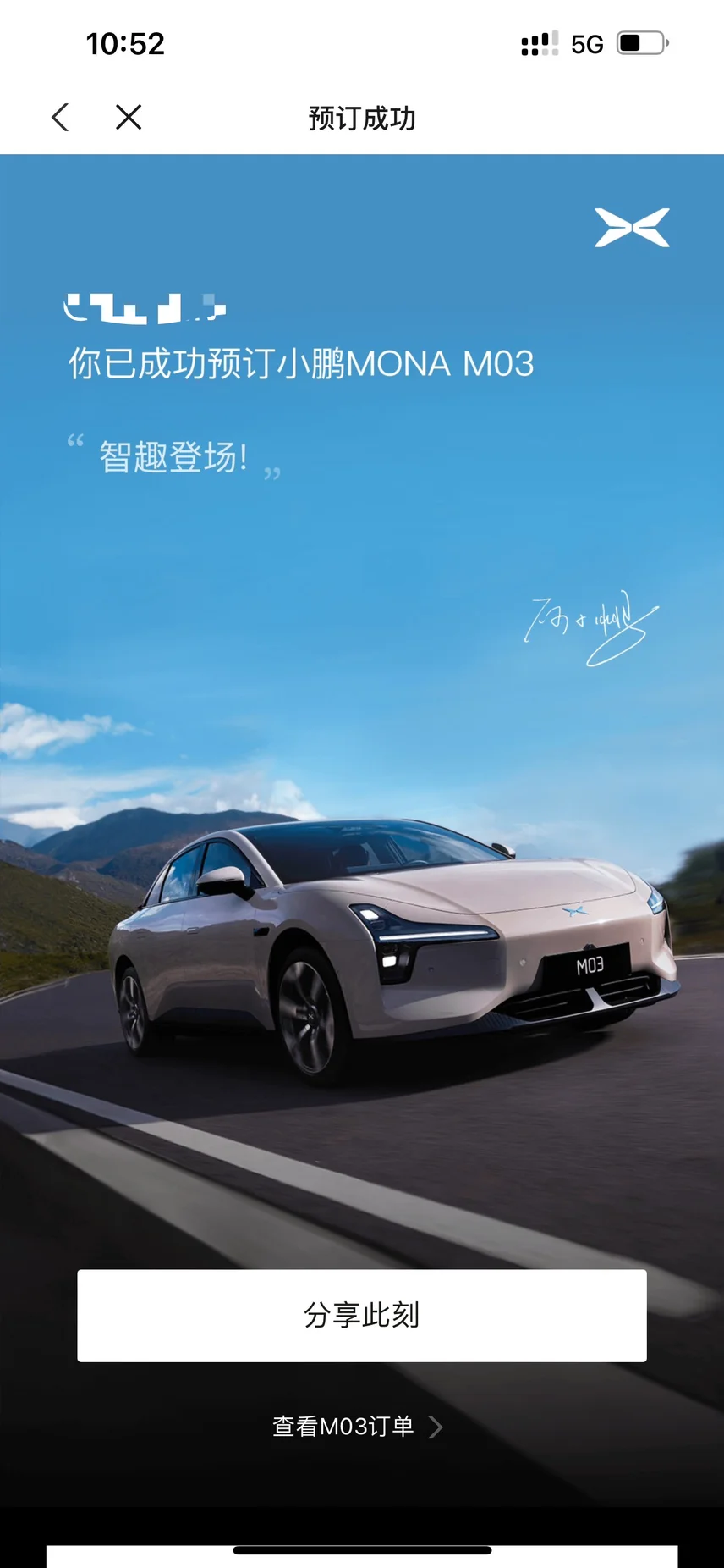 昨天知道今天可以预订MONA M03,一睡醒打开车友群群聊都炸开锅的都在种草,其实我也有被M03的外观颜值和掀背大后备箱给惊艳到,想着年轻人的第一台车定价肯定也不会很贵,所以就赶紧打开app订一台,支持一下,看到时候上市价格出来能不能打动我,让我把我家p5置换掉或者再增购一台给我小妹当通勤代步(年轻人的车,虽然不是第一台,但我也是年轻人)