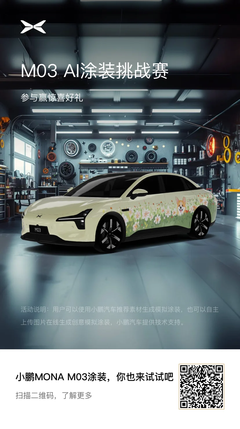 #涂装大师创意挑战# #小鹏MONA M03# 涂装蛮有意思的,手机相册里找了好几张图片,出来都不是自己想要的。AI也没能生成出让我满意的。最后还是小鹏实验室供参考的效果好。MONO M03外观还是不错的,能把车涂装成这样的会是哪个小可爱啊,一定生活恣意与潇洒,慕。