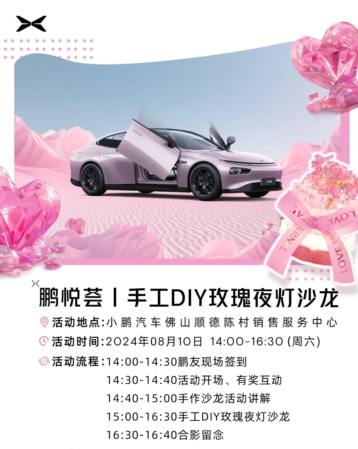 适逢七夕情人节来临之际,我还在挖空心思想着送什么礼物,不想庸俗又不想缺乏诚意,既要不失浪漫又不要过于铺张浪费,然后佛山顺德小鹏汽车销售服务中心就发布了七夕当天的活动~!手工DIY玫瑰夜灯!这不就完全符合了我要送礼物的所有要求了吗?