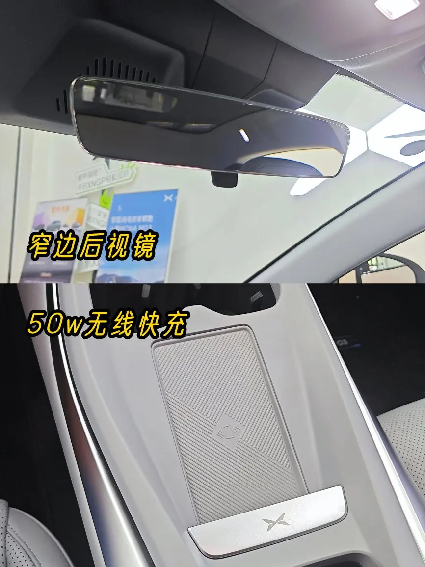 3️⃣前排单50w无线充电,下方的金属logo很精致,后排双C口充电