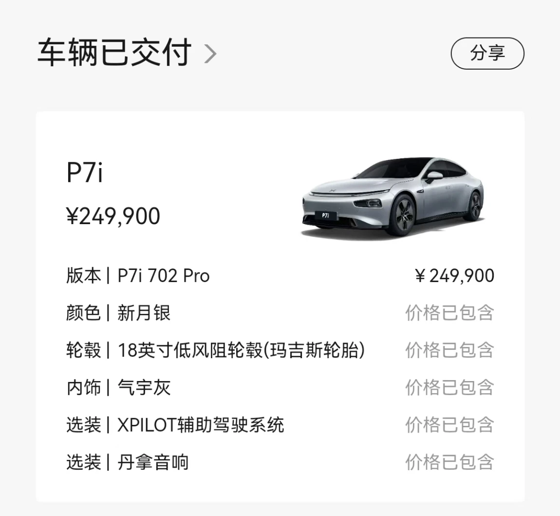 持续关注了一个多月,终于在2022年的末尾为了保留住补贴的权益赶在国补结束前下定了老款P7,但后来又从网上了解到P7马上要推新款了,于是让销售不要给我锁单,终于在2023年三月份新版P7i就发布了,看了价格,24.99W起,和老版P7相比配置升级了不少,全车电吸门+热泵空调+纳帕真皮座椅+电尾门等一百多项升级,物超所值,再送4年6000度电(每年1500度)瞬间香的让人怀疑人生!果断下定,终于在2023年4月18号喜提新车,从P7到P7i,兜兜转转还是鹏友!