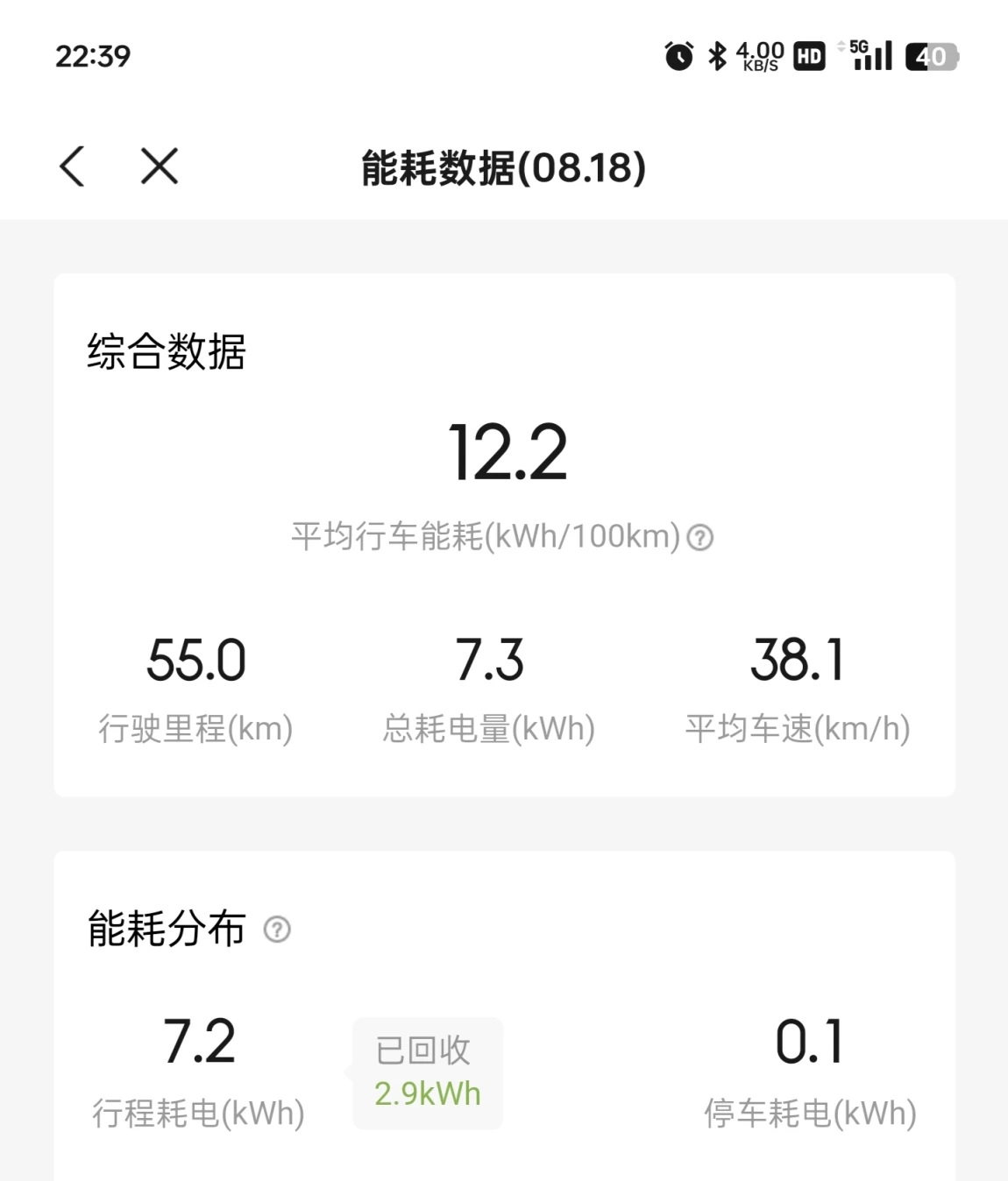 4️⃣电耗情况:55公里,耗电量7.3度,平均电耗12.2