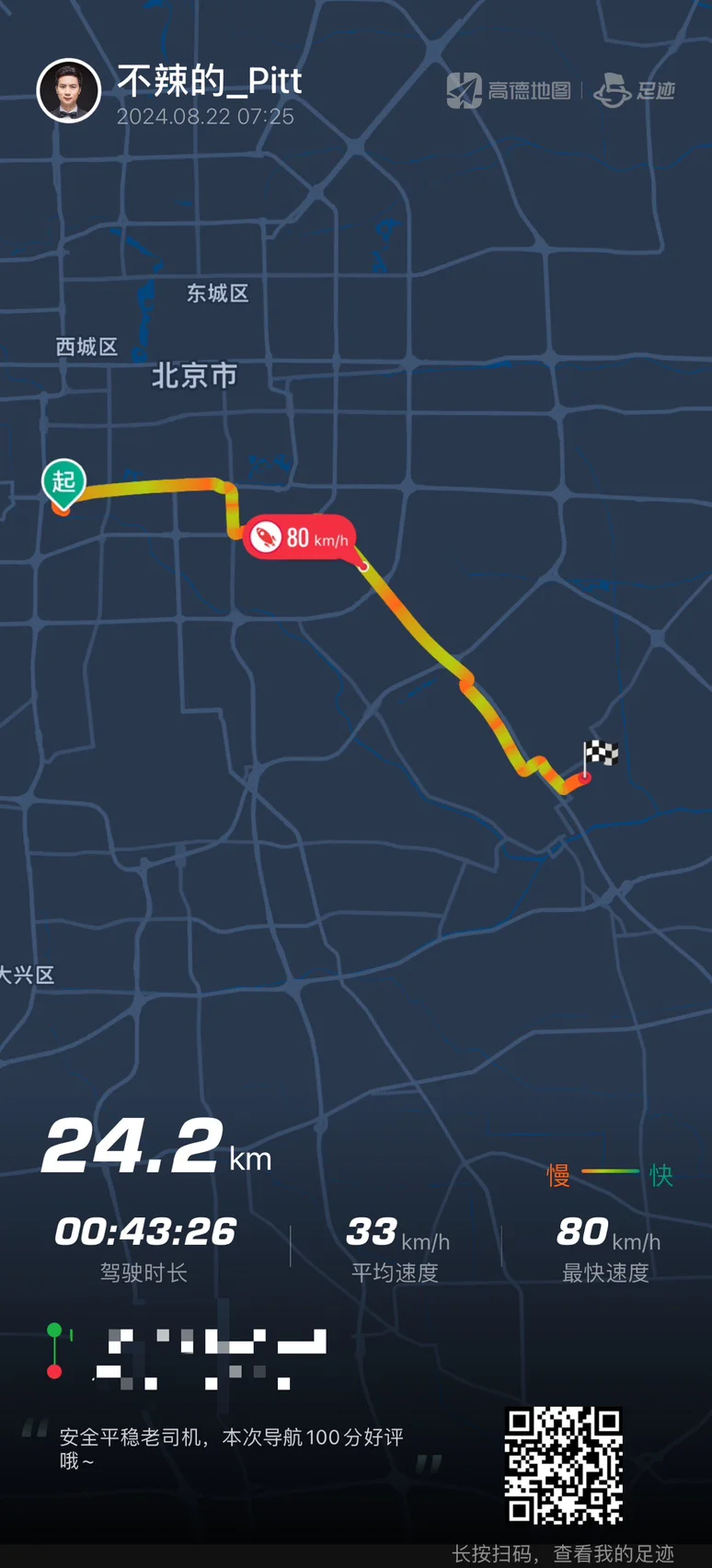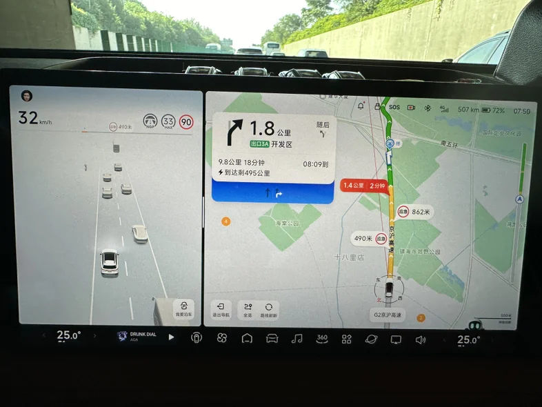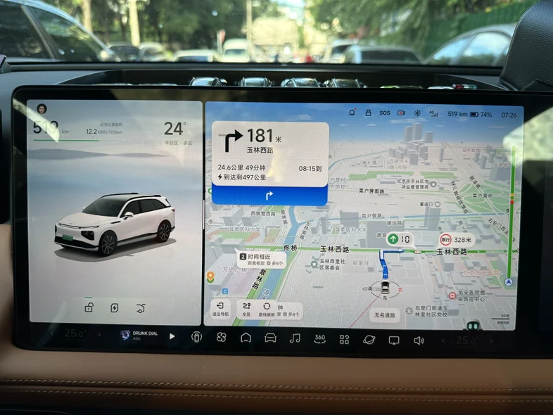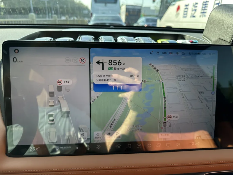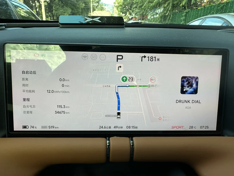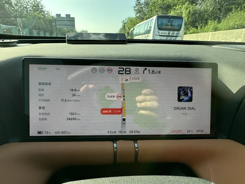 今天早上上班挑战了一下,24.5公里路程,在比高德规划用时快6分钟的前提下(计划用时49分,实际用时43分),空调25度,最高时速80(北京早高峰真跑不起来),全程下来表显综合能耗10.3kWh/100km,实际行驶距离24.4km,cltc续航消耗19km(起步519km-重点500km),cltc续航达成率126%(24/19)。行驶路段为北京南二环、南三环、京沪高速、亦庄开发区,城区50%+高速50%,没有下坡路。