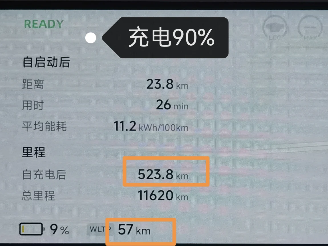 1)充电90%时,我们看到续航达到524+57=581km