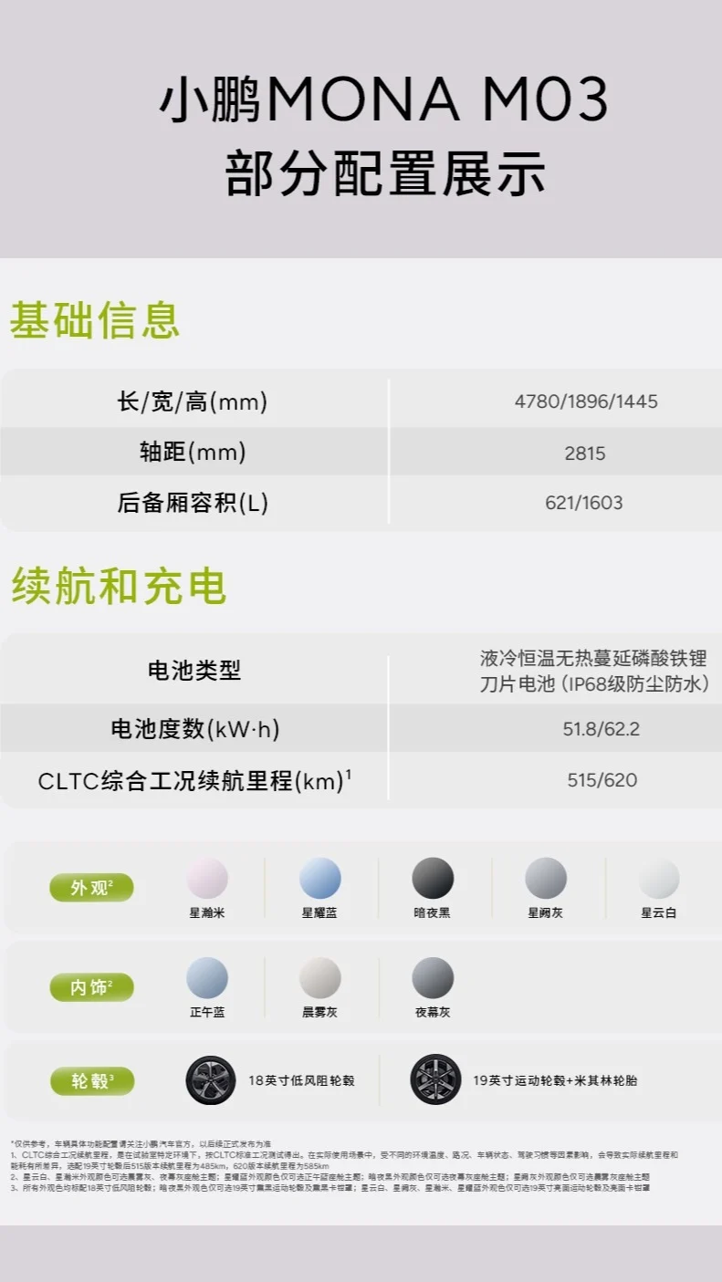 小鹏MONA M03的配置丰富,包括搭载高通8155芯片、16GB超大内存、15.6吋超大高清大屏、18个PSS高级定制扬声器音响系统、电动掀背尾门等。新车还提供了两种电池容量,分别为51.8度和62.2度,对应的CLTC续航里程为515公里和620公里。