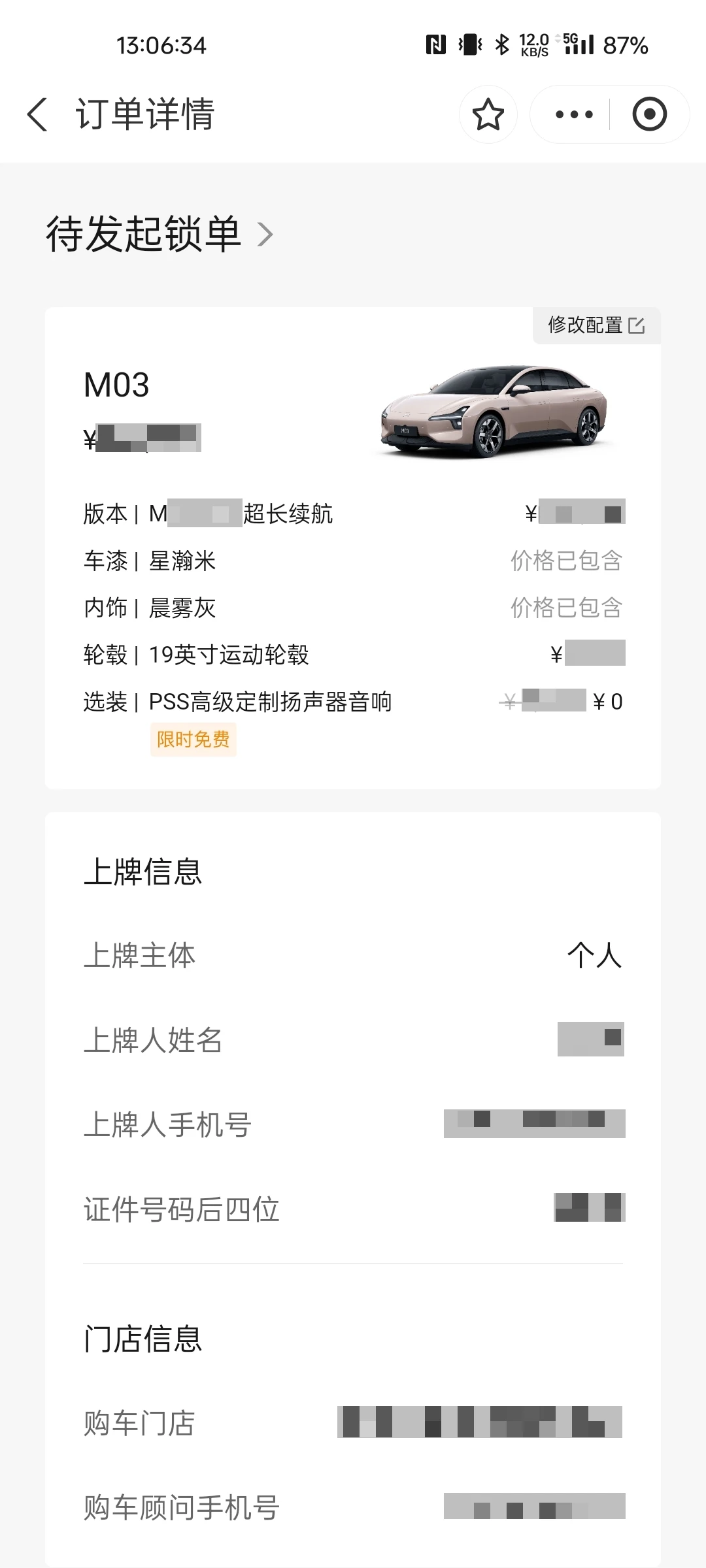 回到展厅,想到拍照最关心的能耗问题了,然后在店里让销售等下一个车主试完看看能耗。然后在店里纠结选择什么颜色,要不要加大轮毂。考虑到不喜欢灰色,黑色容易脏,白色太普通,蓝色太有个性担心容易厌,还是选了最常见的星瀚米配色!刚开始就准备+4000换米其林的轮胎,但是看测评会增加胎噪,也会缩短30km的续航,优点就是帅,问老婆的意见,老婆说喜欢就加吧,于是还是+4000选了19寸的大轮毂!