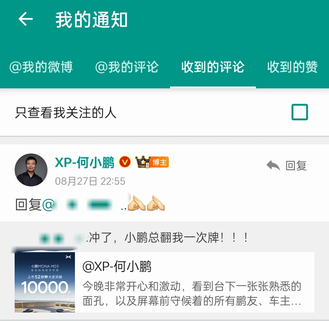 盆友们,小鹏M03第一次的上市预先发布会我就关注了,等到小订的时候第一时间就主动下单了。发布会的当晚激动的睡不着,还到小鹏总的微博下留言了,没想到还被小鹏总翻牌了!