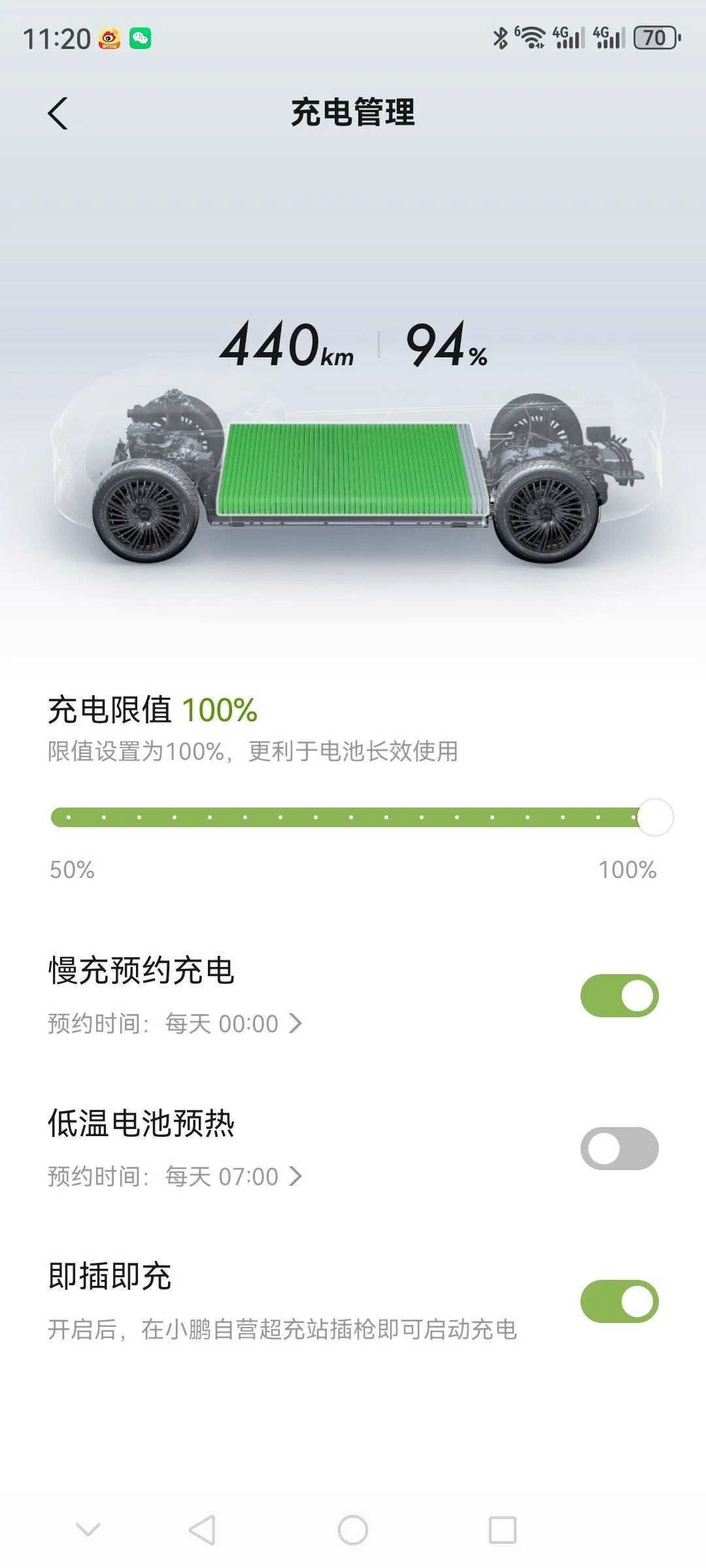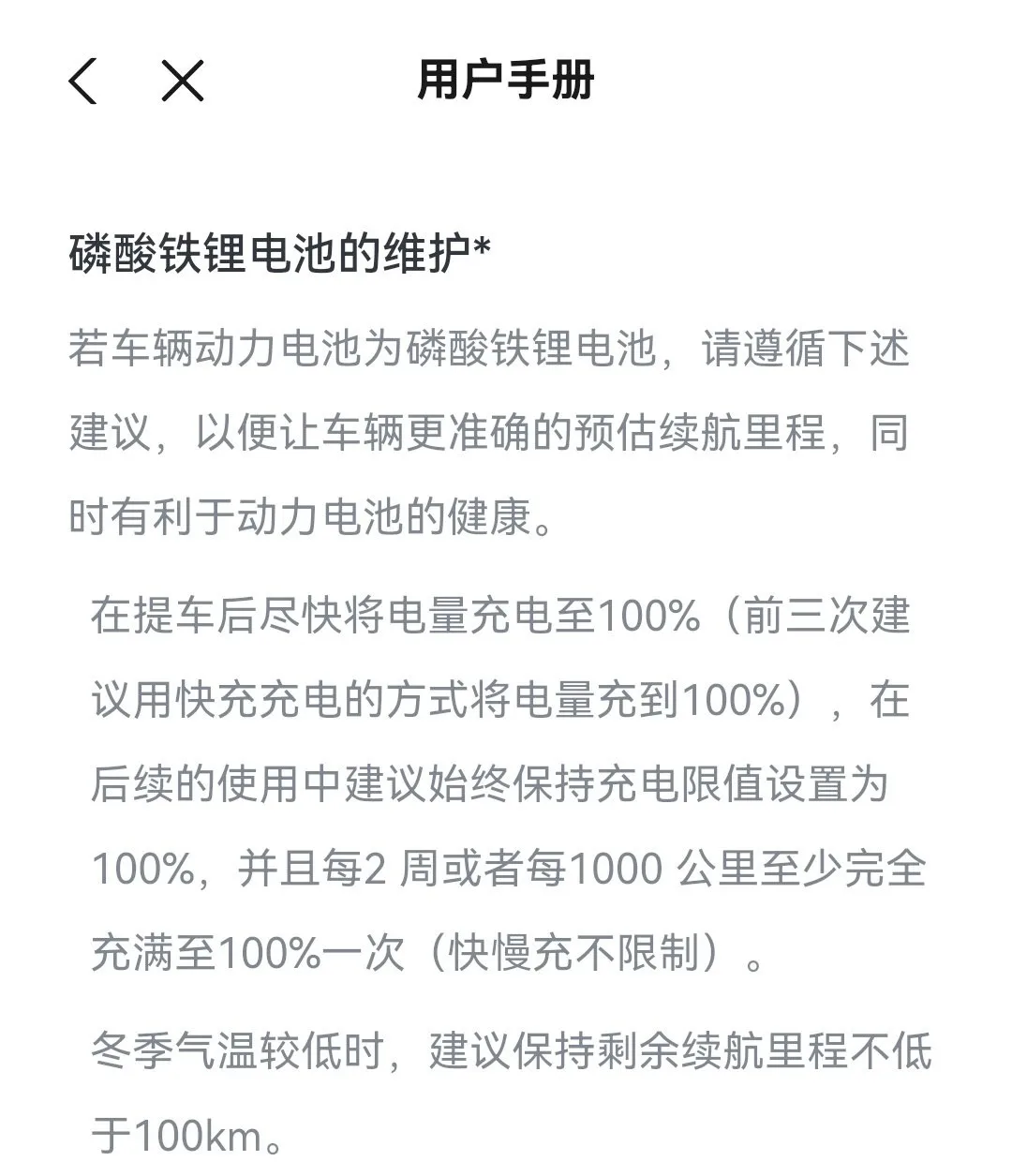 良好的充电习惯,可以使电池损耗减少,从而提高能量的使用率,降低能耗。我的车是小鹏G6 580MAX,使用的是小鹏自研的磷酸铁锂电池,磷酸铁锂电池在充满电的状态下工作时,其内部的化学反应更加稳定,有助于延长电池的使用寿命。在用户手册磷酸铁锂电池的维护中也写道,使用中建议始终保持充电限值设置为100%,并且每2周或者每1000 公里至少完全充满至100%一次。所以我把充电限值成默认的100%,并每次充电尽量充满。